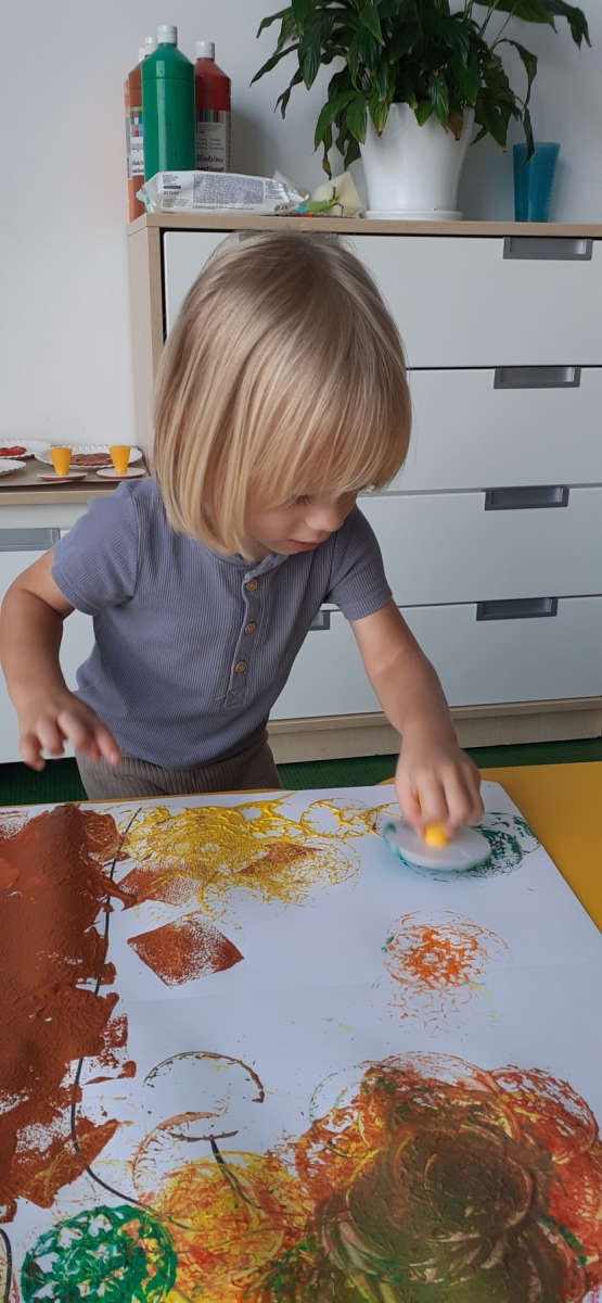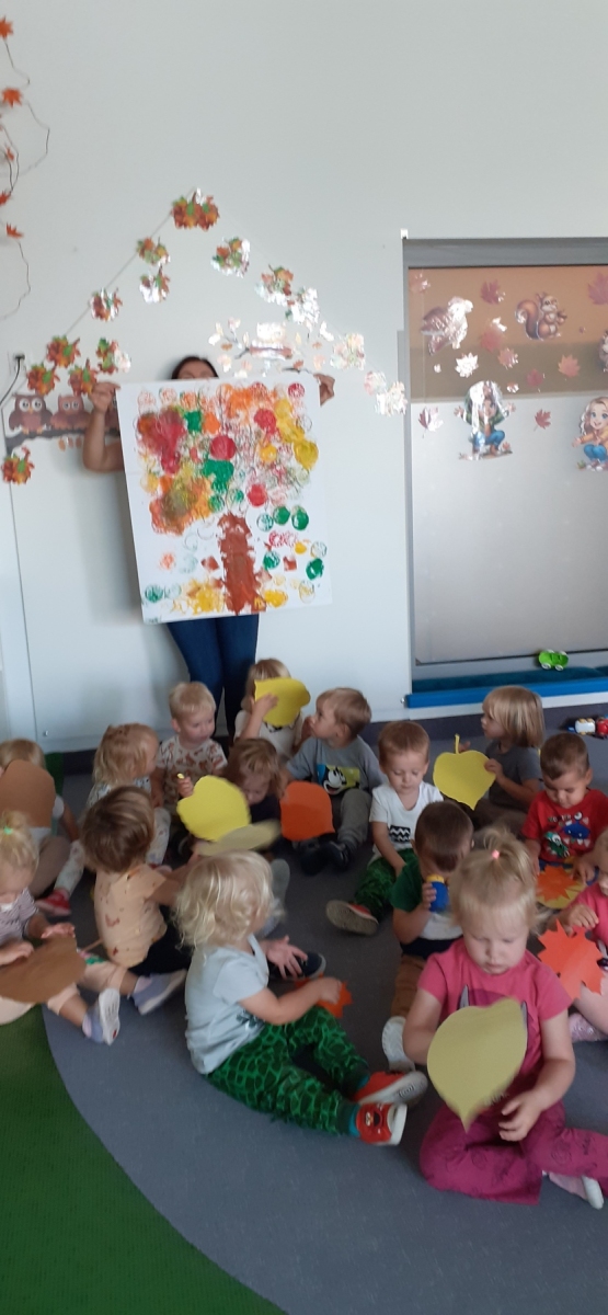 Dzisiejszego dnia Motylki wykonały wspólną pracę plastyczną pt. „Jesienne drzewko”. Do jego wykonania użyliśmy farb plakatowych, stempli oraz gąbeczek. Celebrowaliśmy w ten sposób Pierwszy Dzień Jesieni. Takie zajęcia mają na celu budzenie ciekawości, rozwój funkcji poznawczych, przysparzają wielowymiarowe doznania wzrokowe. Przede wszystkim jest to oswojenie dzieci z różnymi metodami plastycznymi oraz nauka współpracy w grupie.