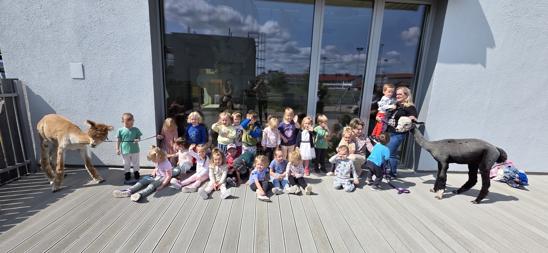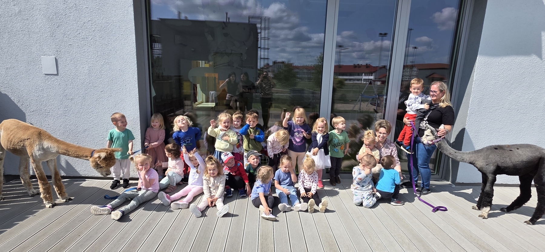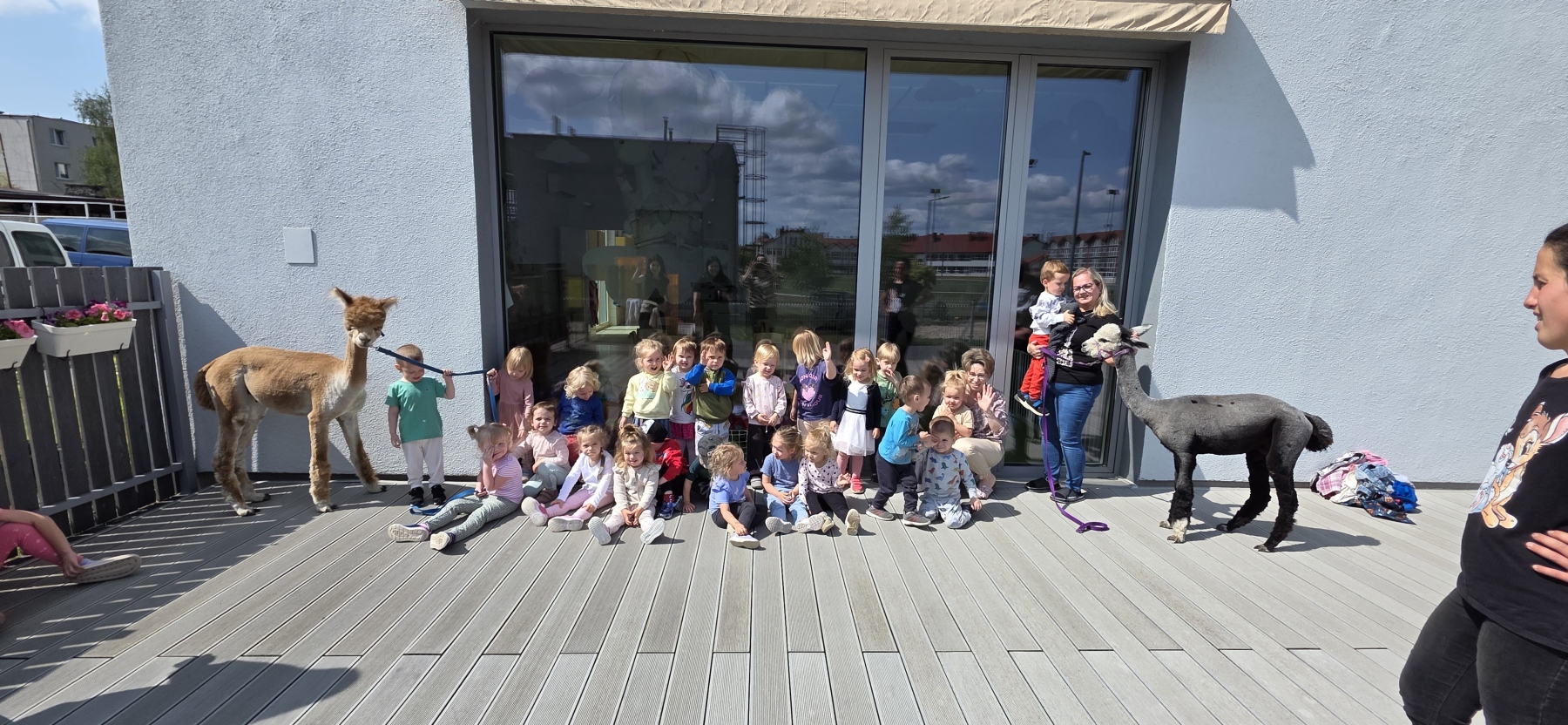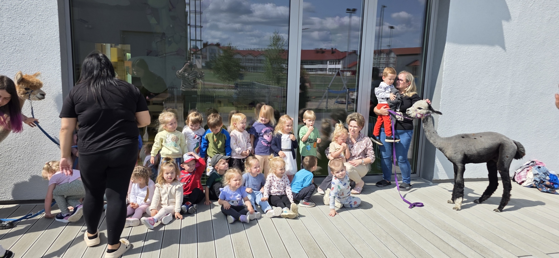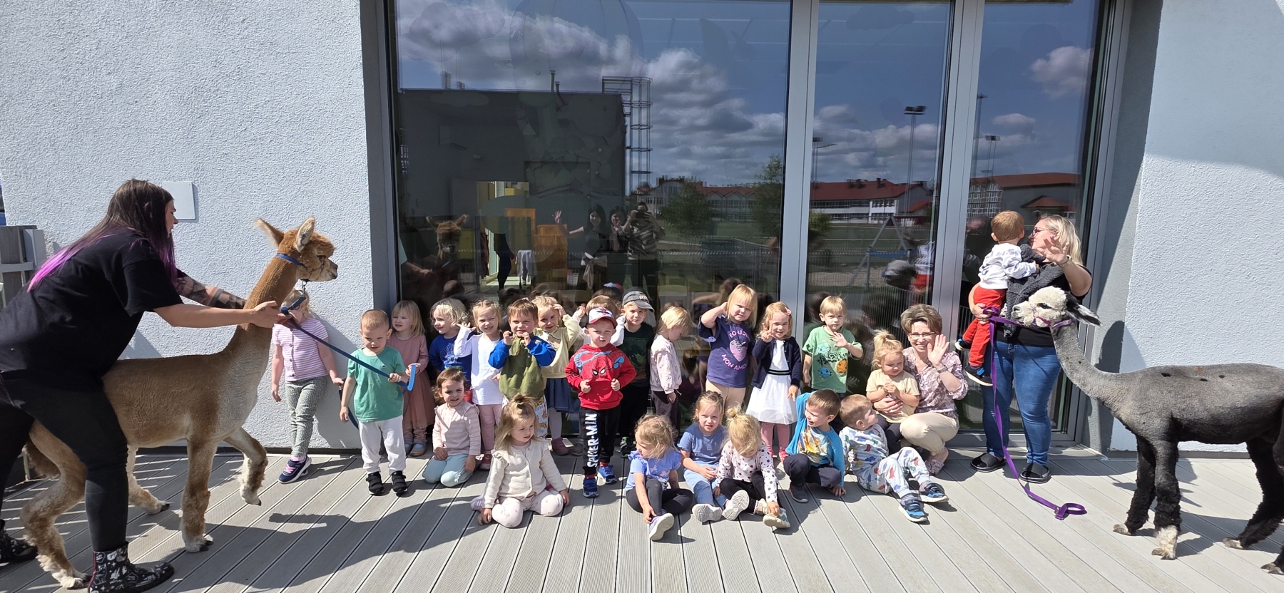 Dzięki uprzejmości pani Kingi i Matyldy z Wiejskiego Podwórka z Bobolina gościliśmy w naszym żłobku niecodzienne zwierzęta – Alpaki.