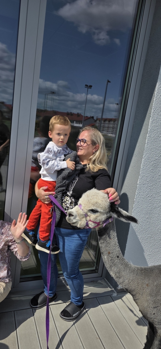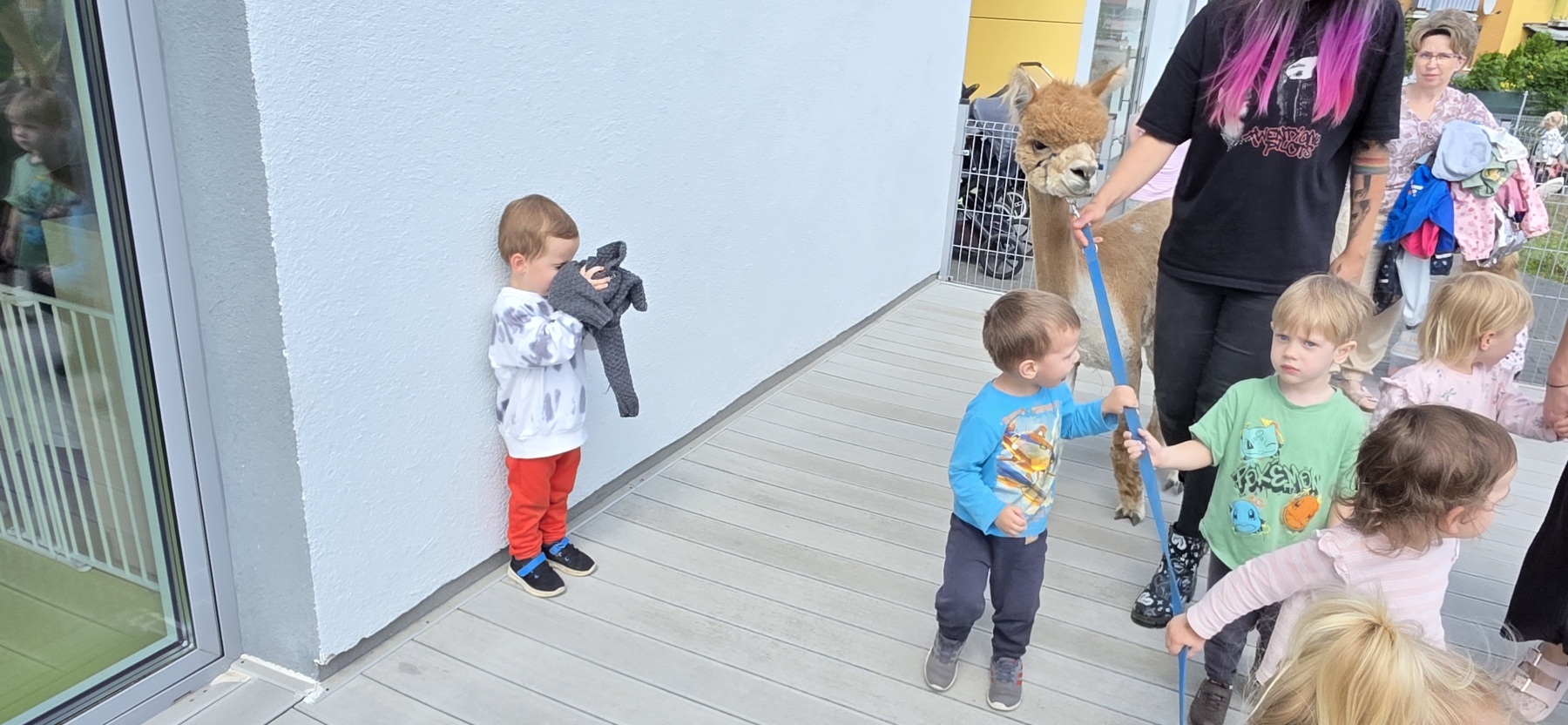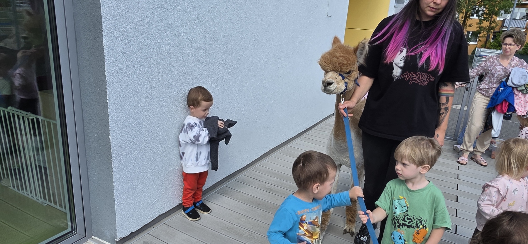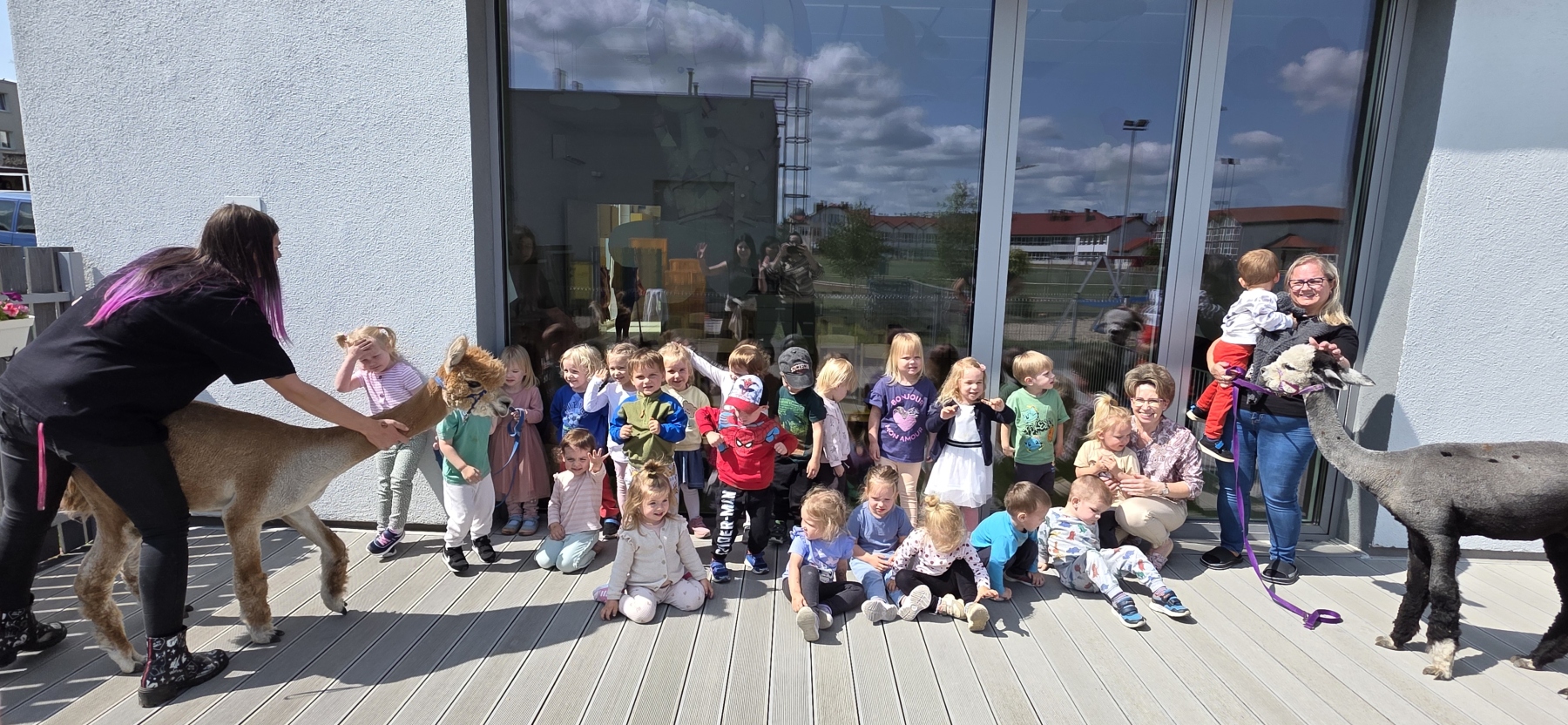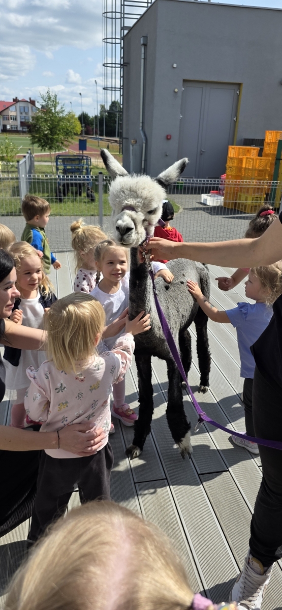 Dzięki uprzejmości pani Kingi i Matyldy z Wiejskiego Podwórka z Bobolina gościliśmy w naszym żłobku niecodzienne zwierzęta – Alpaki.