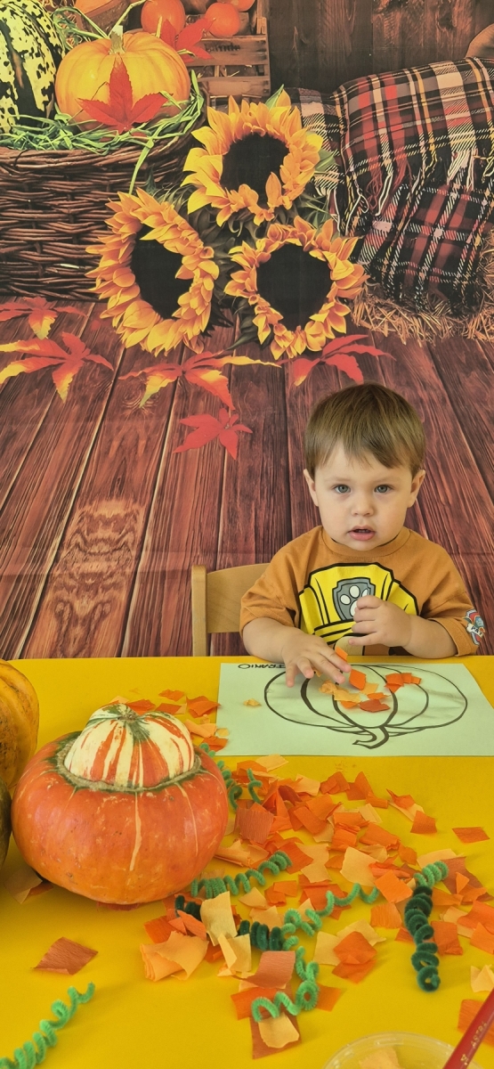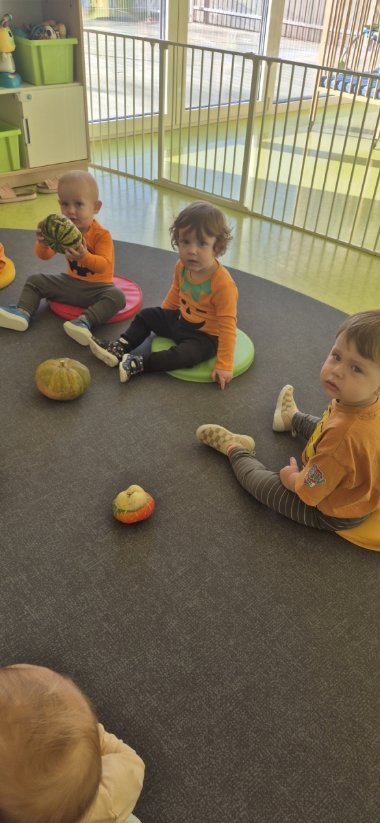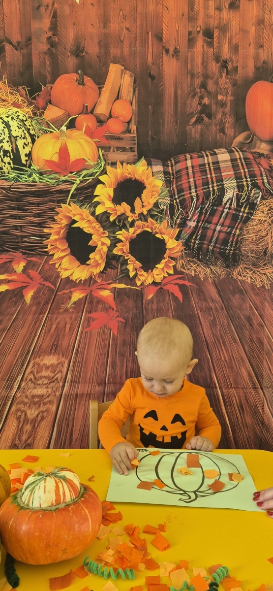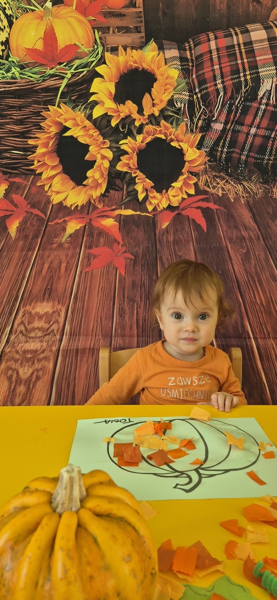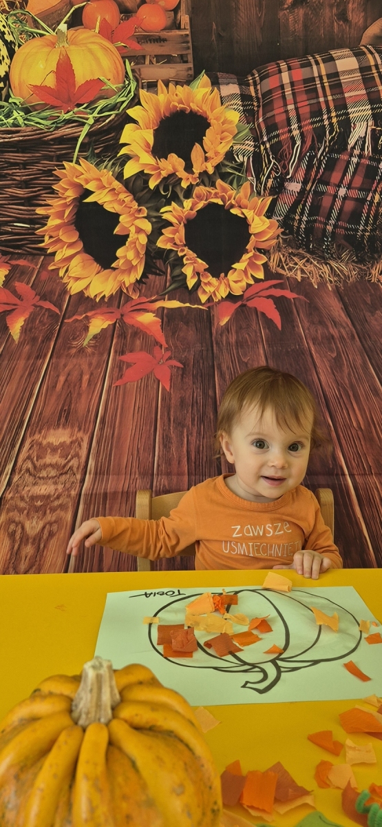 Dzisiaj obchodziliśmy Dzień dyni. Cała sala była pomarańczowa od naszych ubrań. DO tego mogliśmy dotknąć, popukać i poturlać prawdziwe dynie. Okazało się, że są twarde i ciężkie. Potem kawałkami bibuły wykleiliśmy papierowe dynie. Przy pracy kleiły się nasze paluszki, przez co rozruszały się nasze rączki, oczy ćwiczyły widzenie kolorów i wszystko świetnie udało nam się zrobić. To był wesoły pomarańczowy dzień.