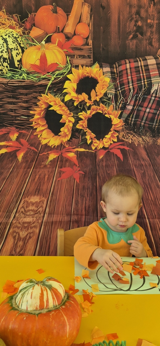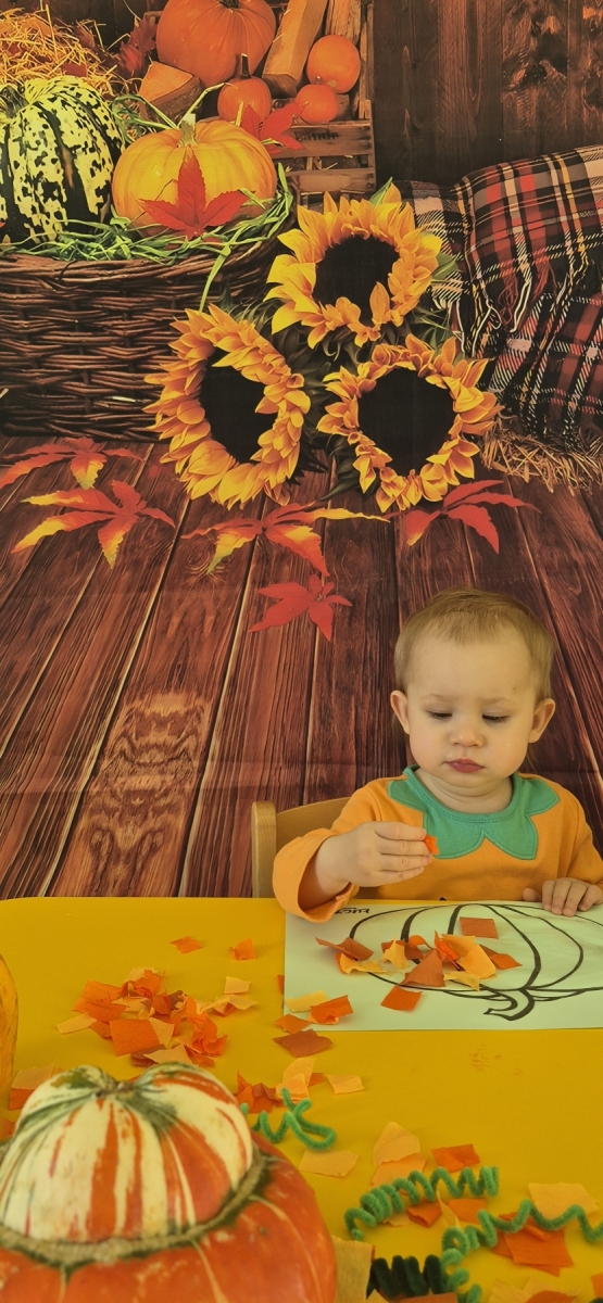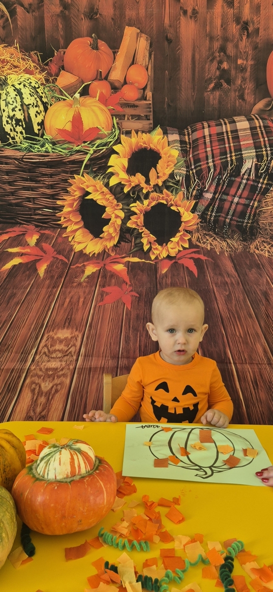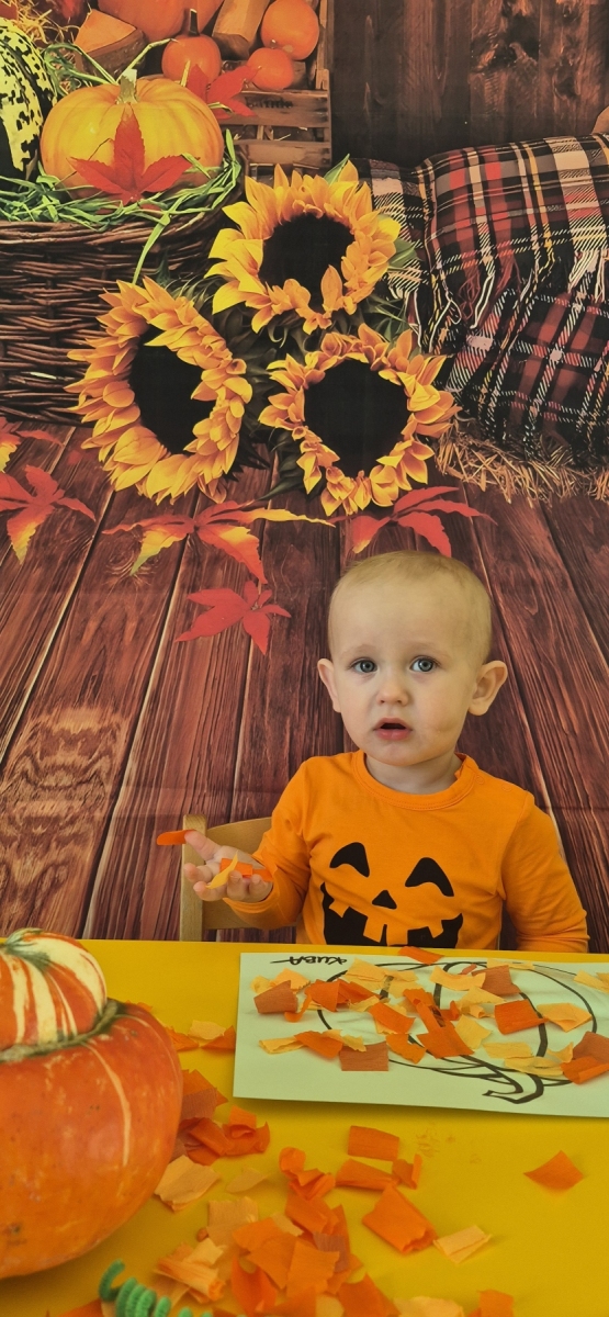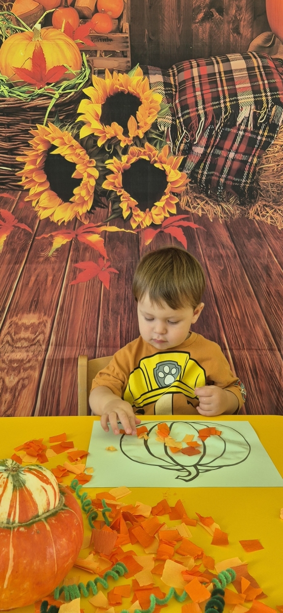 Dzisiaj obchodziliśmy Dzień dyni. Cała sala była pomarańczowa od naszych ubrań. DO tego mogliśmy dotknąć, popukać i poturlać prawdziwe dynie. Okazało się, że są twarde i ciężkie. Potem kawałkami bibuły wykleiliśmy papierowe dynie. Przy pracy kleiły się nasze paluszki, przez co rozruszały się nasze rączki, oczy ćwiczyły widzenie kolorów i wszystko świetnie udało nam się zrobić. To był wesoły pomarańczowy dzień.