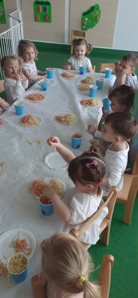 Dzień spaghetti w żłobku to okazja do sensorycznych zabaw z makaronem, idealna do ćwiczeń motoryki małej. Nasz kolorowy makaron nie tylko dzieci dotykają, wąchają, ale też sortują tworząc z niego kompozycje. Na koniec zabawy zjadają z apetytem.