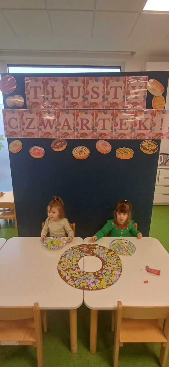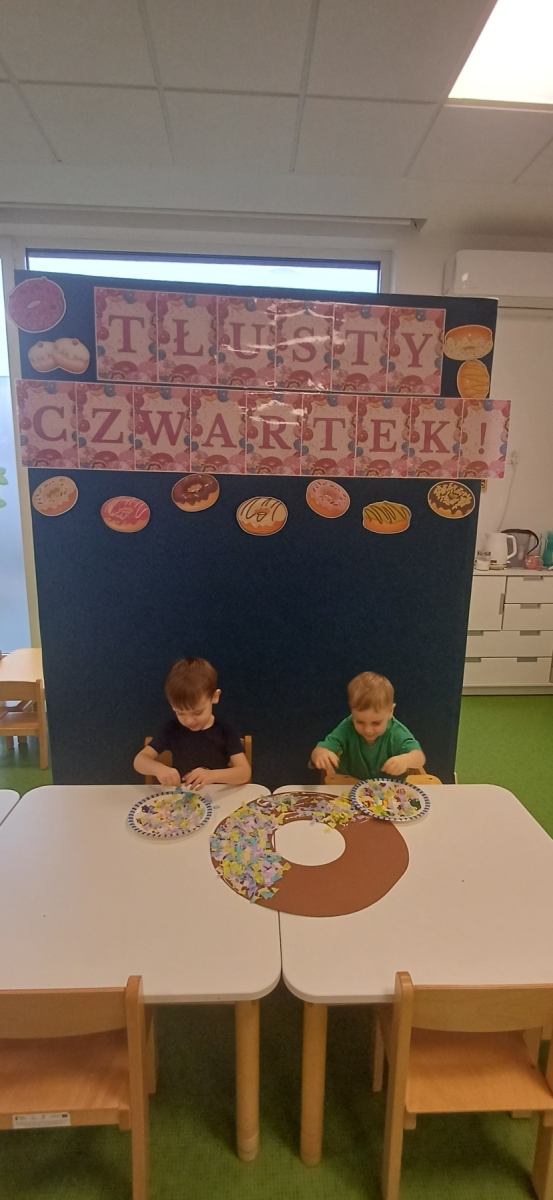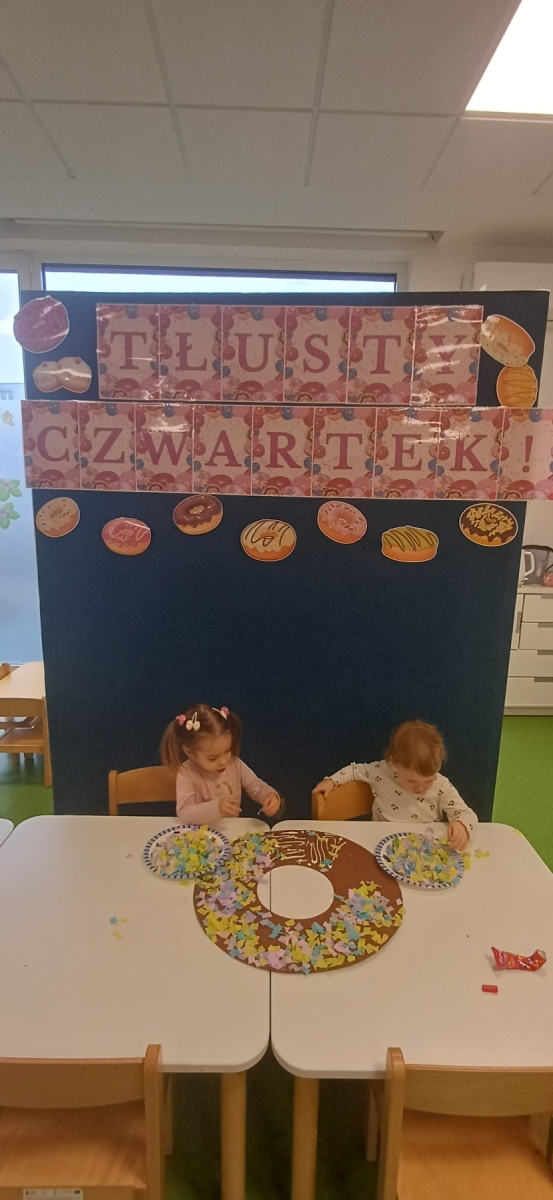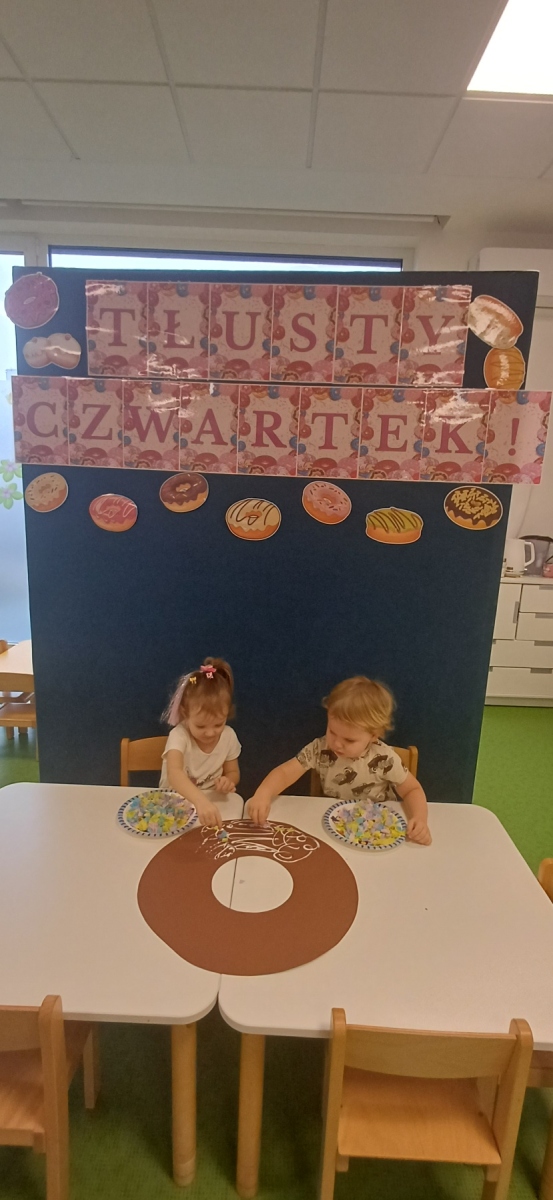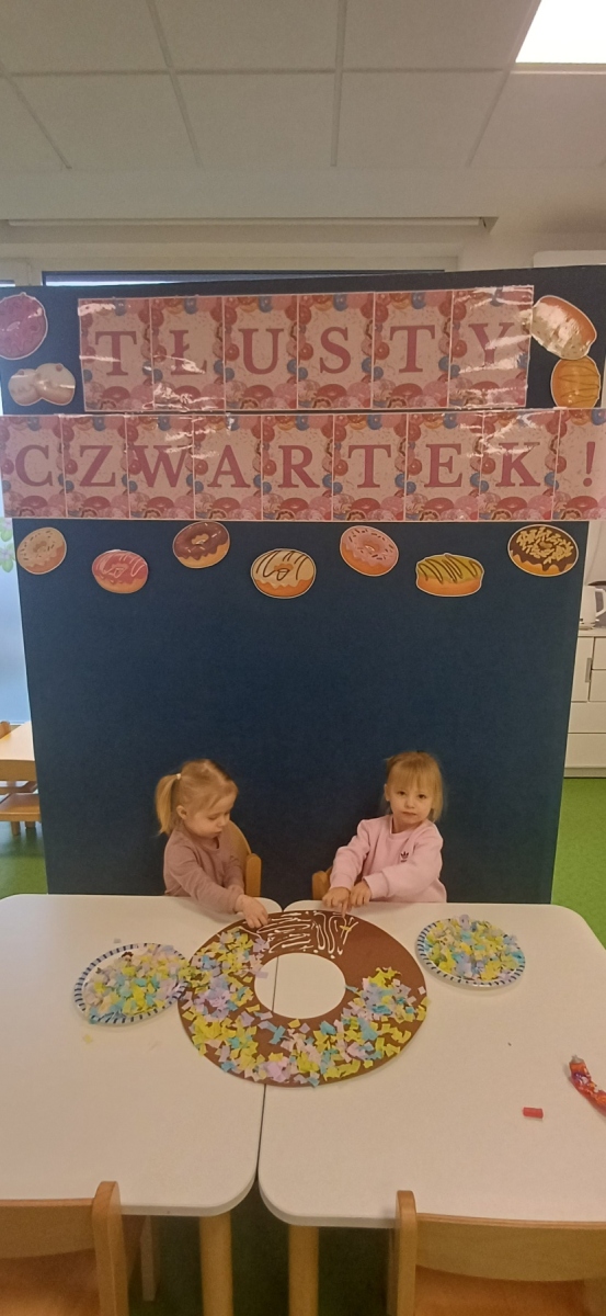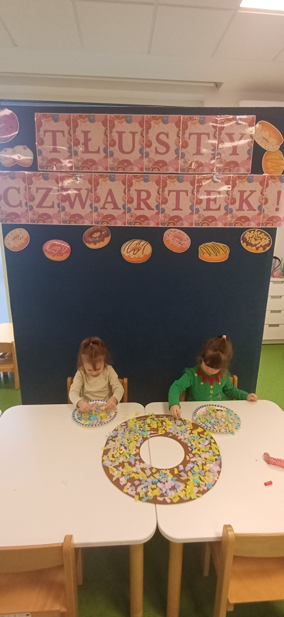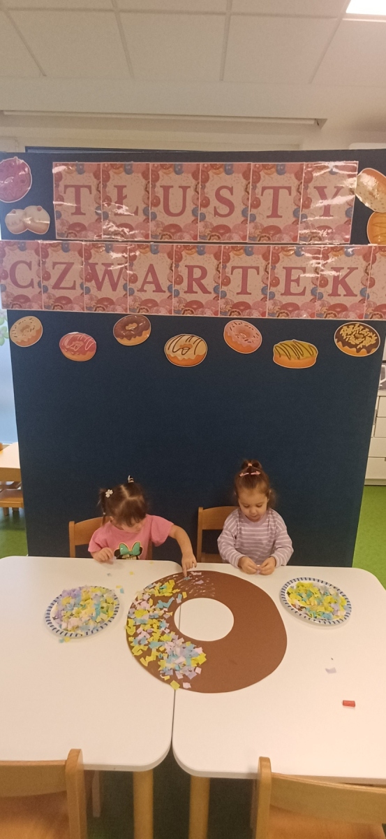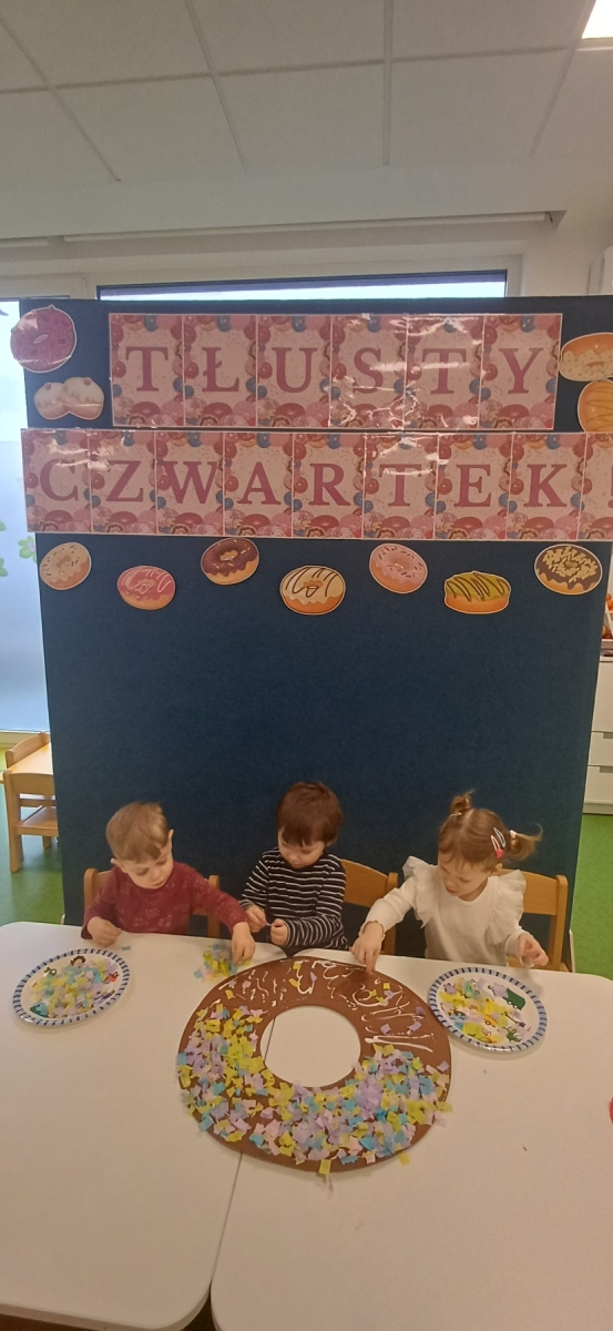 Tłusty czwartek jest dniem hucznego objadania się, w którym główną rolę odgrywają pączki faworki. Dzieci w naszej grupie również świętowały i zajadały pyszne pączki. Wykonały również pracę plastyczną- pączka z kolorową posypką.