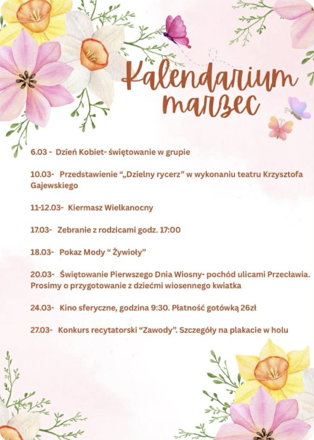 Kalendarium i treści programowe na miesiąc marzec dla Grupy Gruszki