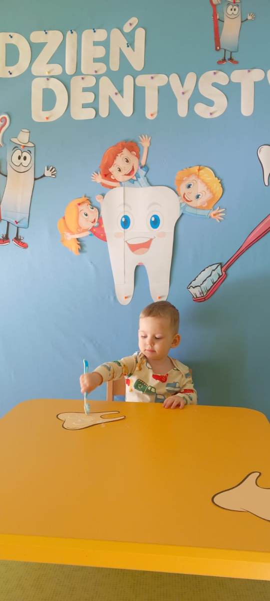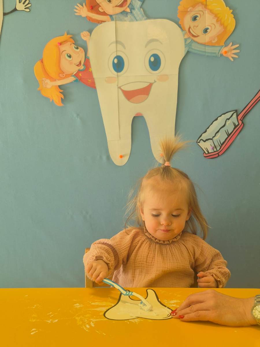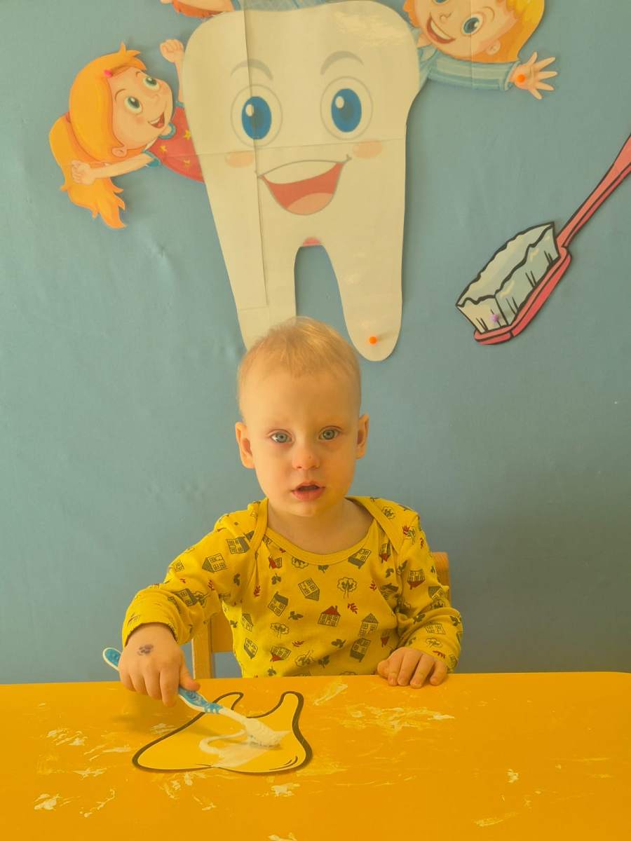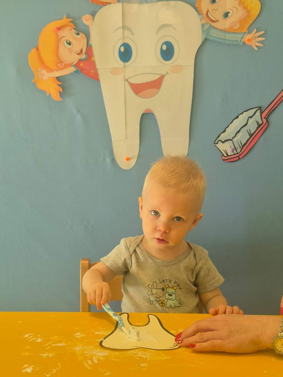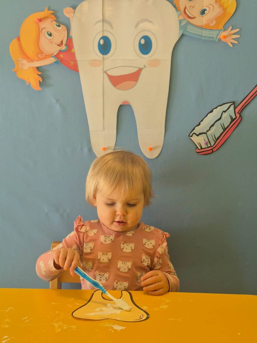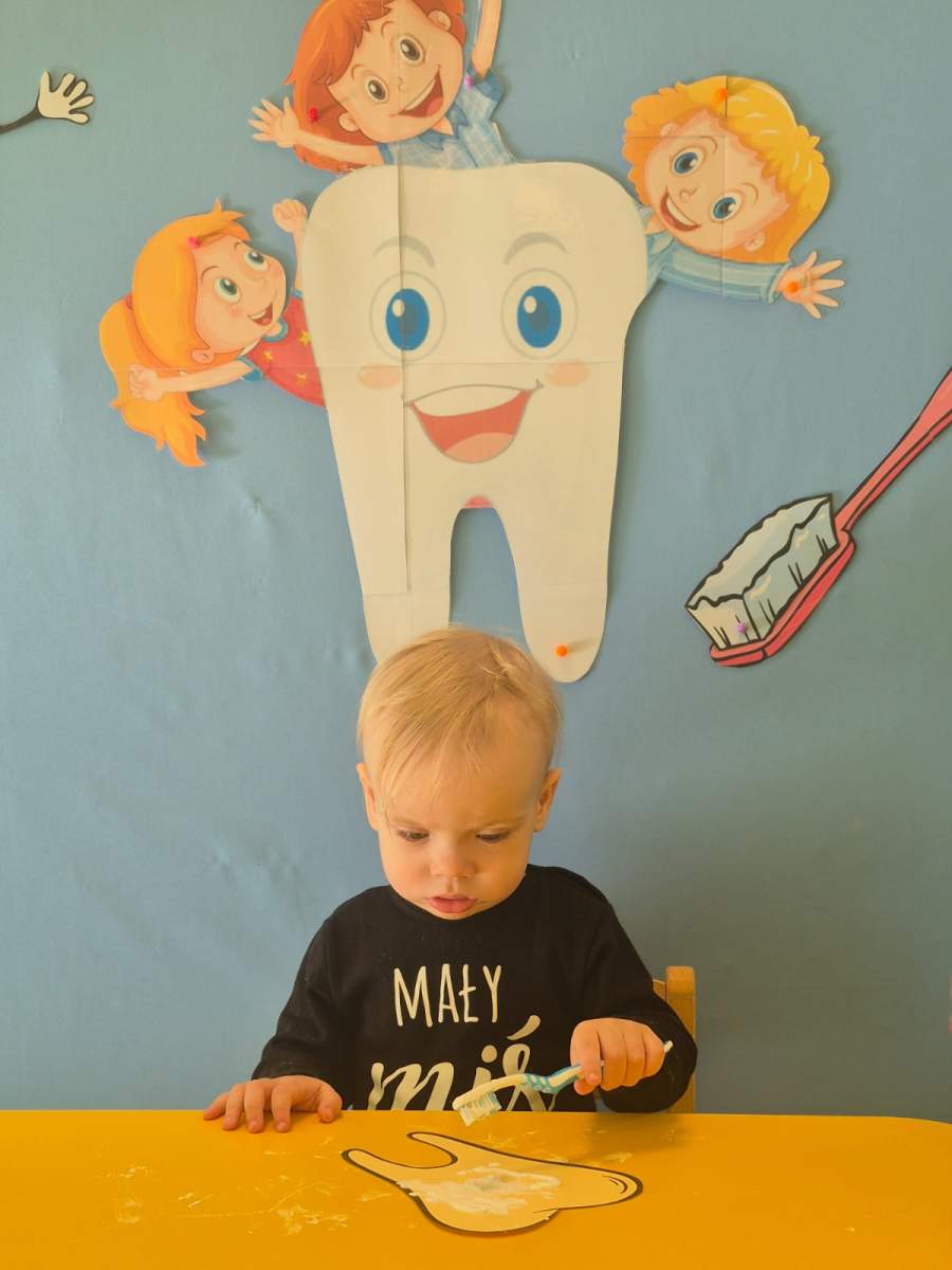 Motylki, choć maluszki podeszły do tego dnia bardzo poważnie. Doskonale wiedziały do czego służy szczoteczka i pasta. Z dużym zaangażowaniem czyściły sztuczne ząbki na makiecie, ale rączki chciały też maszerować do buźki. Widać z tego, że dzieci ćwiczą mycie własnych zębów. Pastę też lubią popróbować… cała gama doznań. Dodatkowo trzymając szczoteczkę, malowały farbą kartonowe ząbki, przez co doskonaliły ruch i nawyk mycia. Na twarzach dzieci widać było uśmiechy , a w oczach ciekawość i radość. To był dzień pełen zabawy, ale i ukrytej nauki, a to Motylki lubią najbardziej.