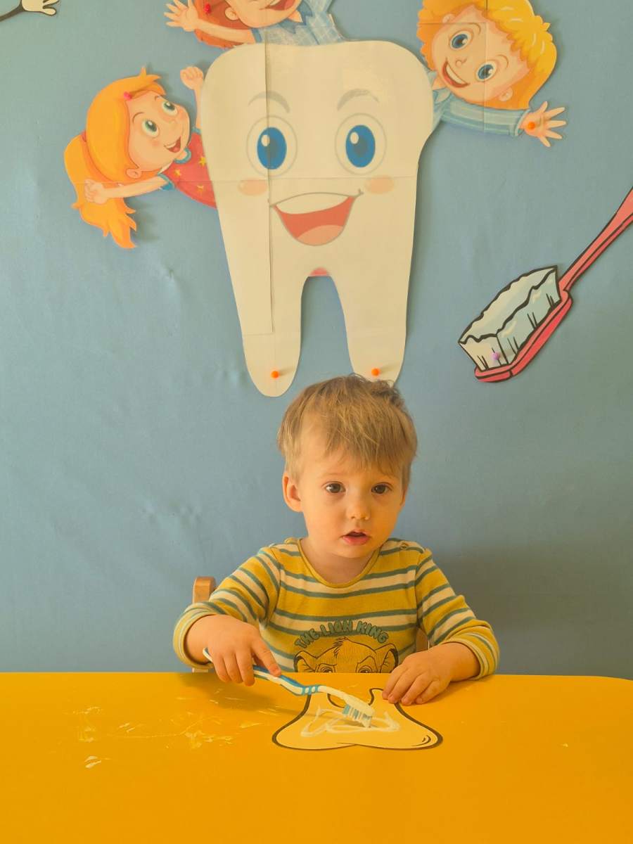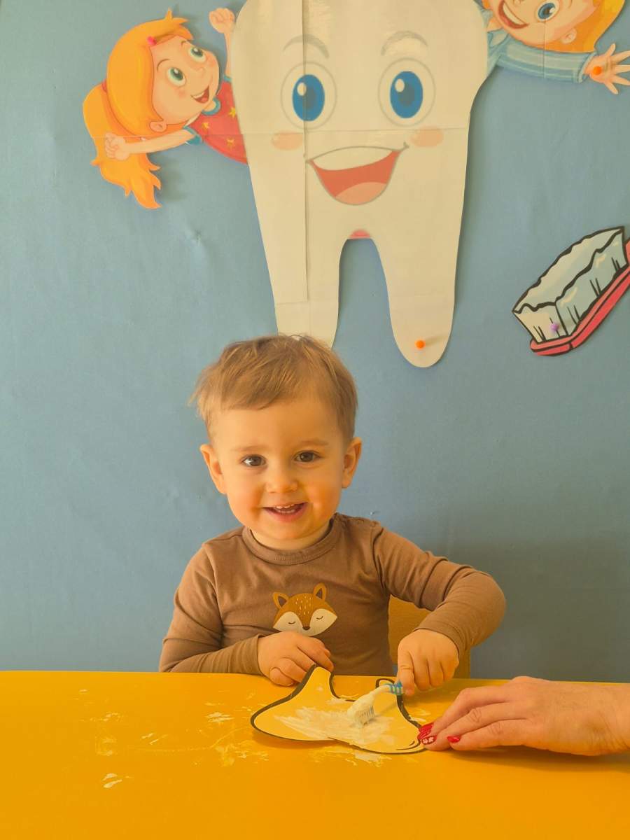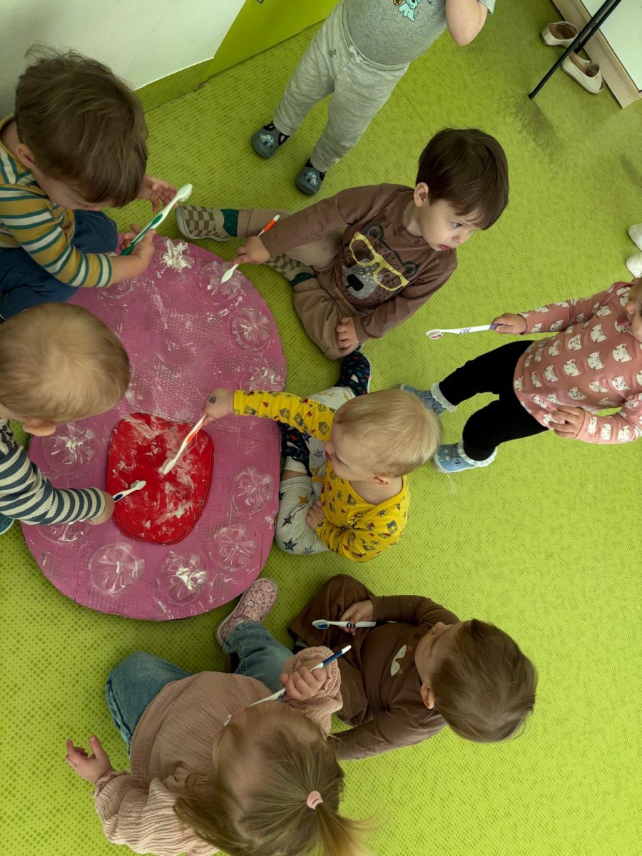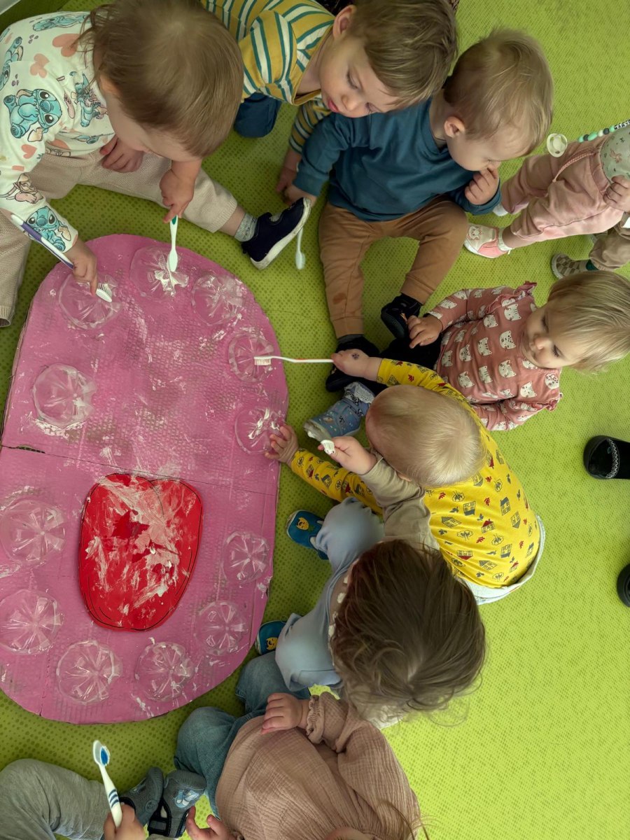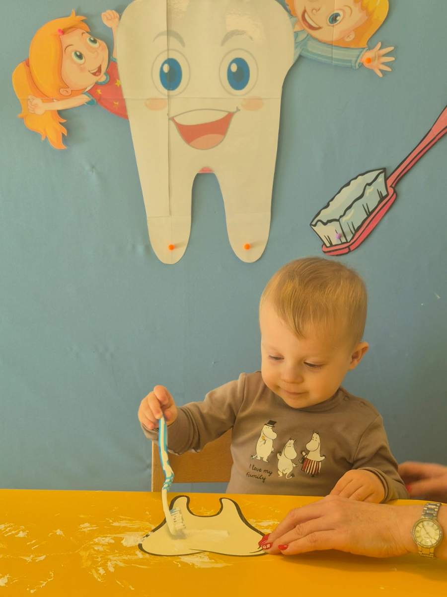 Motylki, choć maluszki podeszły do tego dnia bardzo poważnie. Doskonale wiedziały do czego służy szczoteczka i pasta. Z dużym zaangażowaniem czyściły sztuczne ząbki na makiecie, ale rączki chciały też maszerować do buźki. Widać z tego, że dzieci ćwiczą mycie własnych zębów. Pastę też lubią popróbować… cała gama doznań. Dodatkowo trzymając szczoteczkę, malowały farbą kartonowe ząbki, przez co doskonaliły ruch i nawyk mycia. Na twarzach dzieci widać było uśmiechy , a w oczach ciekawość i radość. To był dzień pełen zabawy, ale i ukrytej nauki, a to Motylki lubią najbardziej.