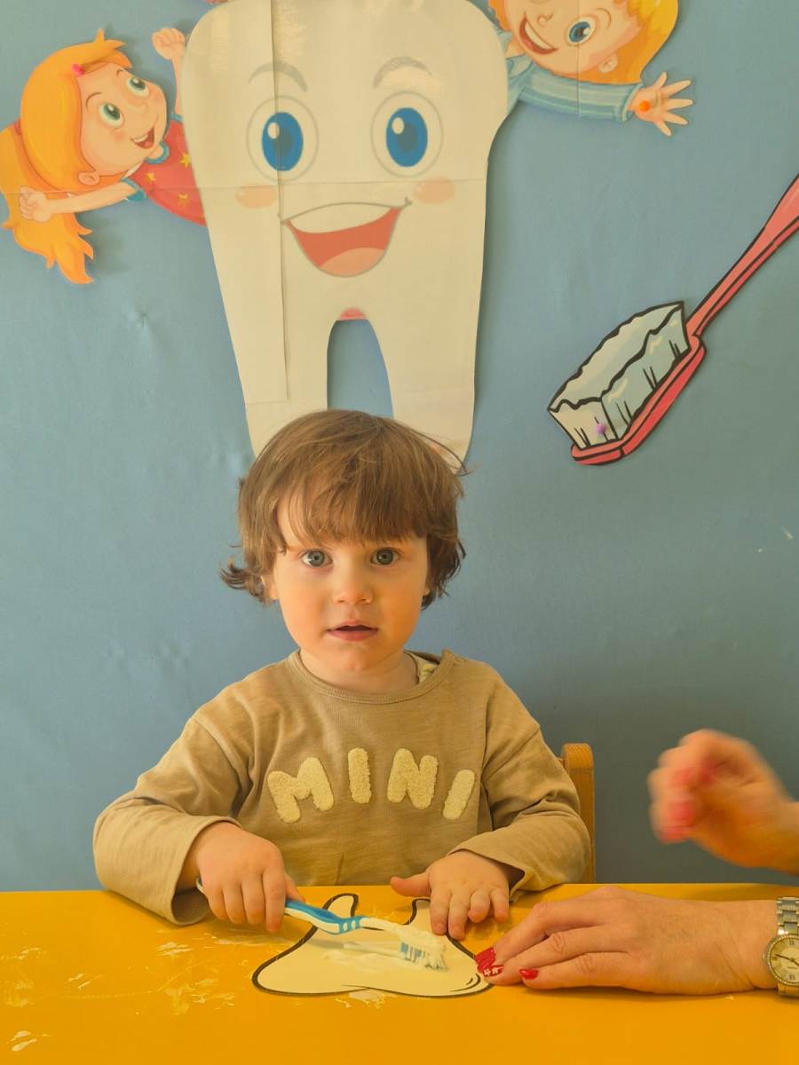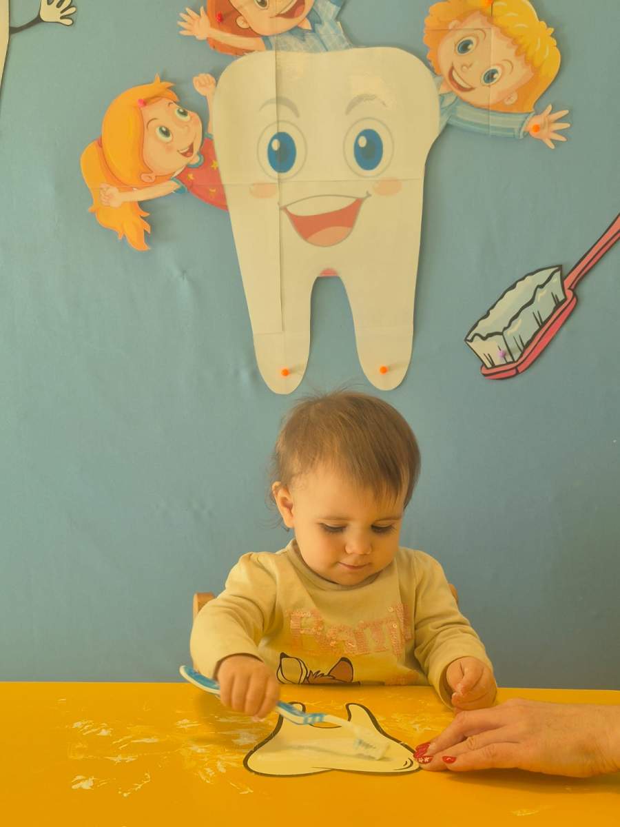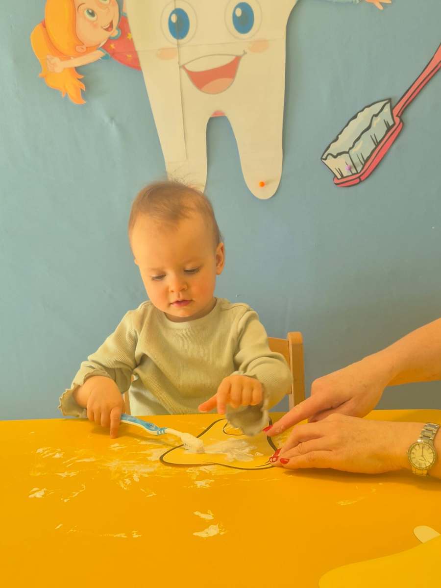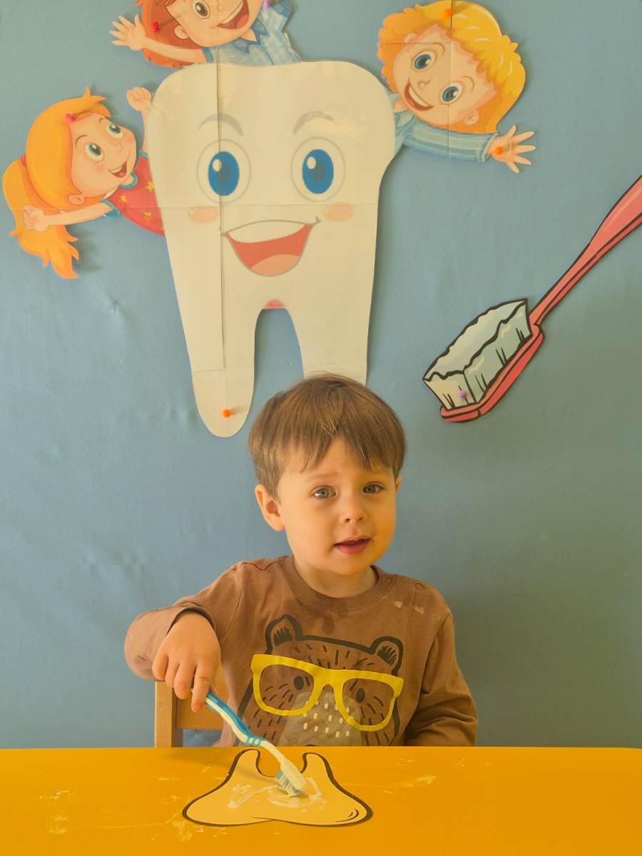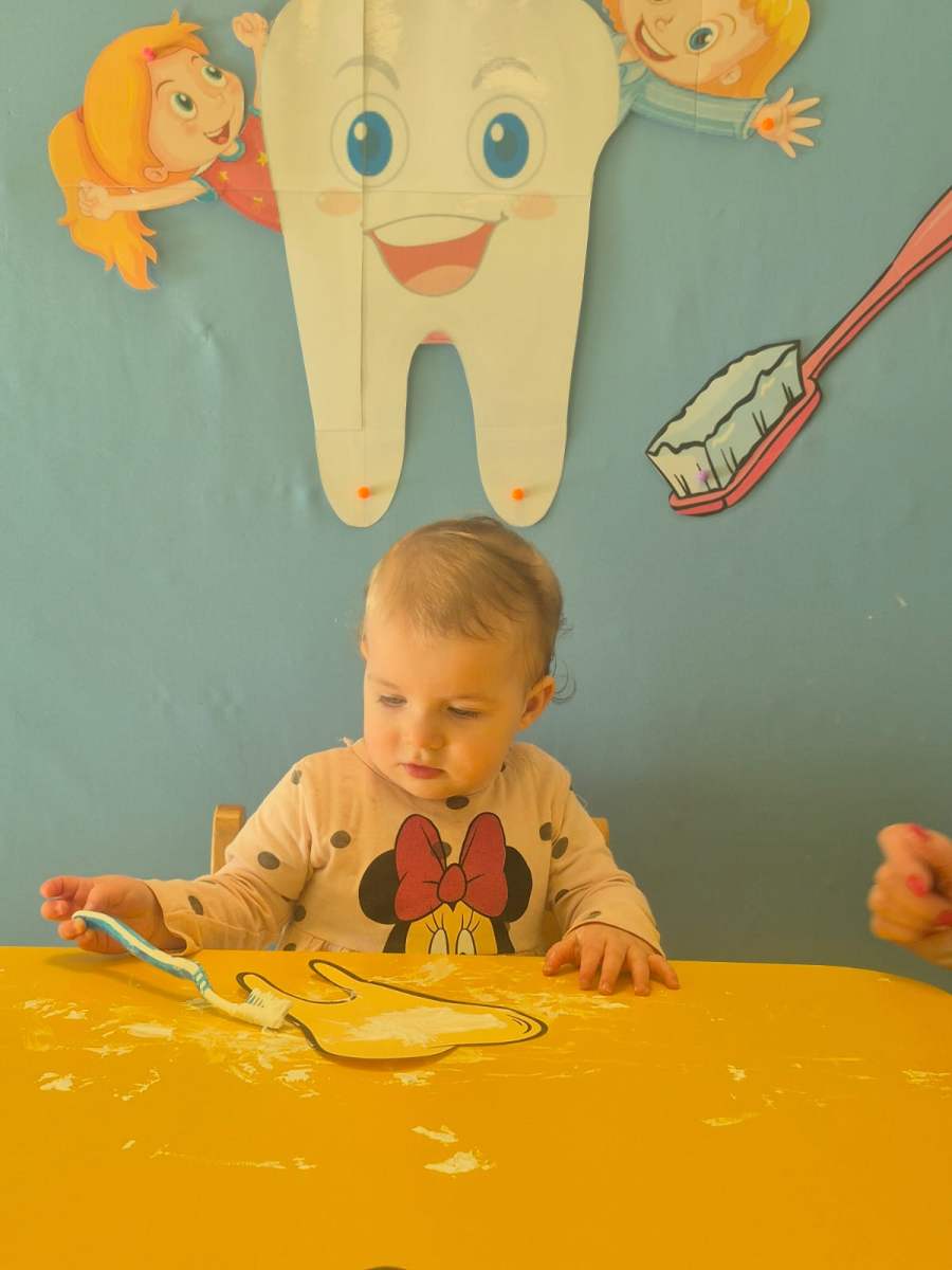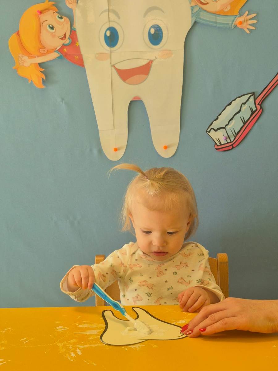 Motylki, choć maluszki podeszły do tego dnia bardzo poważnie. Doskonale wiedziały do czego służy szczoteczka i pasta. Z dużym zaangażowaniem czyściły sztuczne ząbki na makiecie, ale rączki chciały też maszerować do buźki. Widać z tego, że dzieci ćwiczą mycie własnych zębów. Pastę też lubią popróbować… cała gama doznań. Dodatkowo trzymając szczoteczkę, malowały farbą kartonowe ząbki, przez co doskonaliły ruch i nawyk mycia. Na twarzach dzieci widać było uśmiechy , a w oczach ciekawość i radość. To był dzień pełen zabawy, ale i ukrytej nauki, a to Motylki lubią najbardziej.