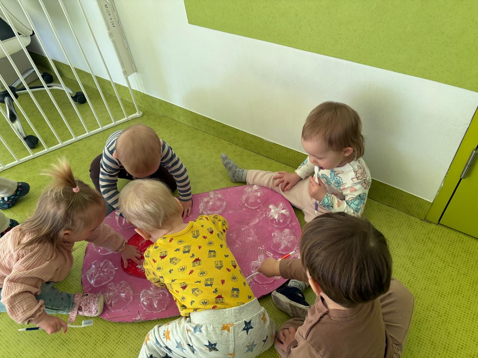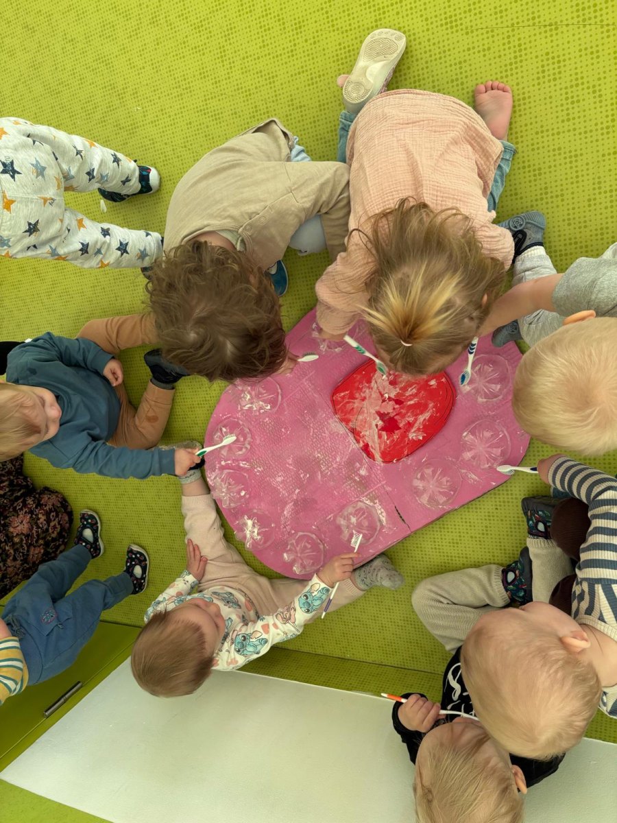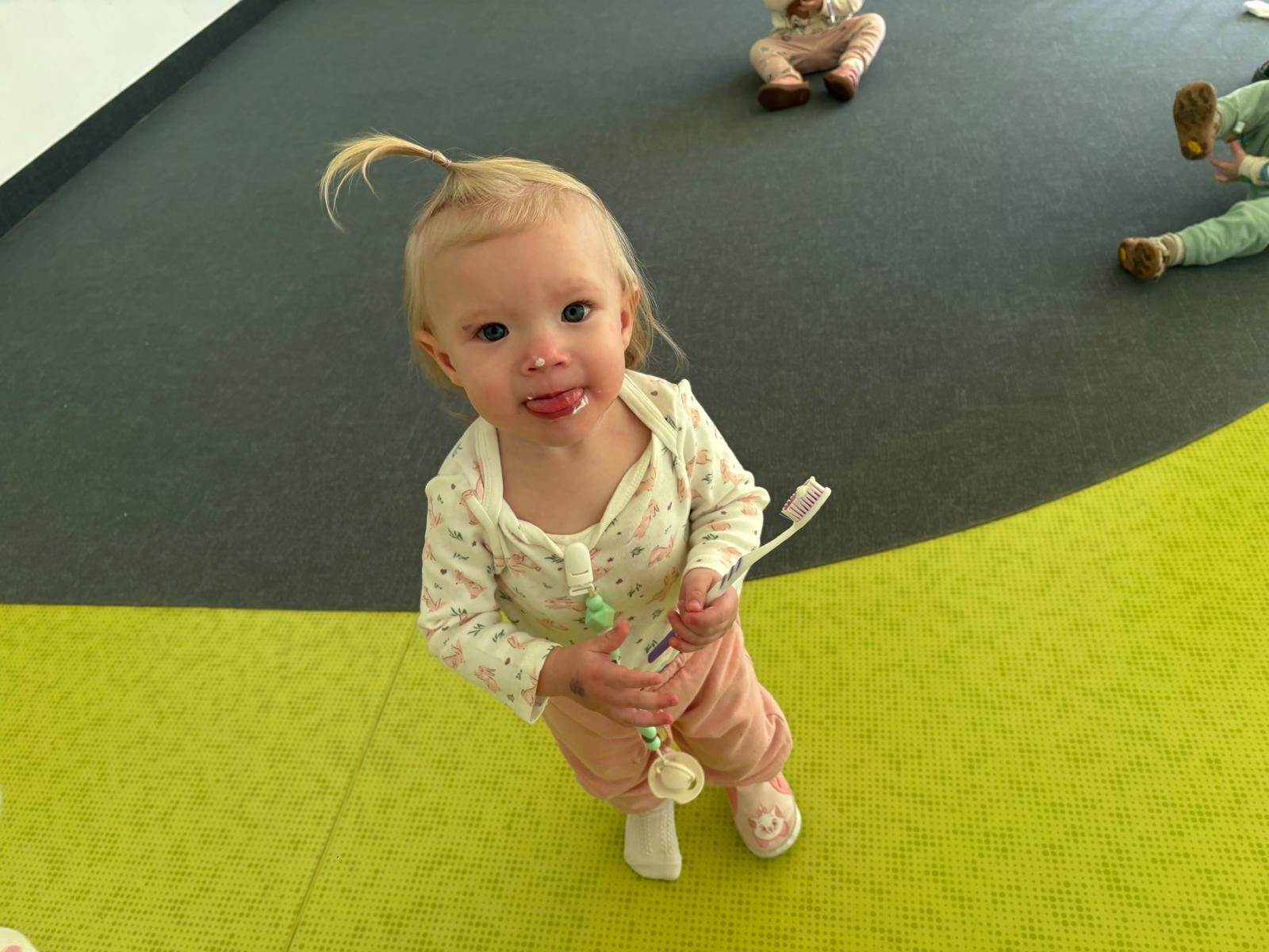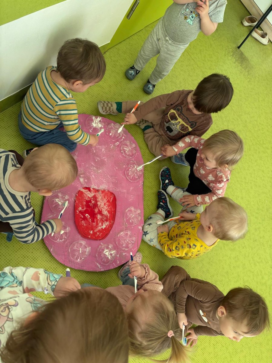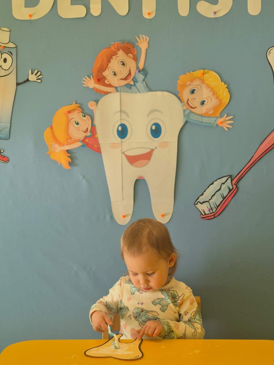 Motylki, choć maluszki podeszły do tego dnia bardzo poważnie. Doskonale wiedziały do czego służy szczoteczka i pasta. Z dużym zaangażowaniem czyściły sztuczne ząbki na makiecie, ale rączki chciały też maszerować do buźki. Widać z tego, że dzieci ćwiczą mycie własnych zębów. Pastę też lubią popróbować… cała gama doznań. Dodatkowo trzymając szczoteczkę, malowały farbą kartonowe ząbki, przez co doskonaliły ruch i nawyk mycia. Na twarzach dzieci widać było uśmiechy , a w oczach ciekawość i radość. To był dzień pełen zabawy, ale i ukrytej nauki, a to Motylki lubią najbardziej.