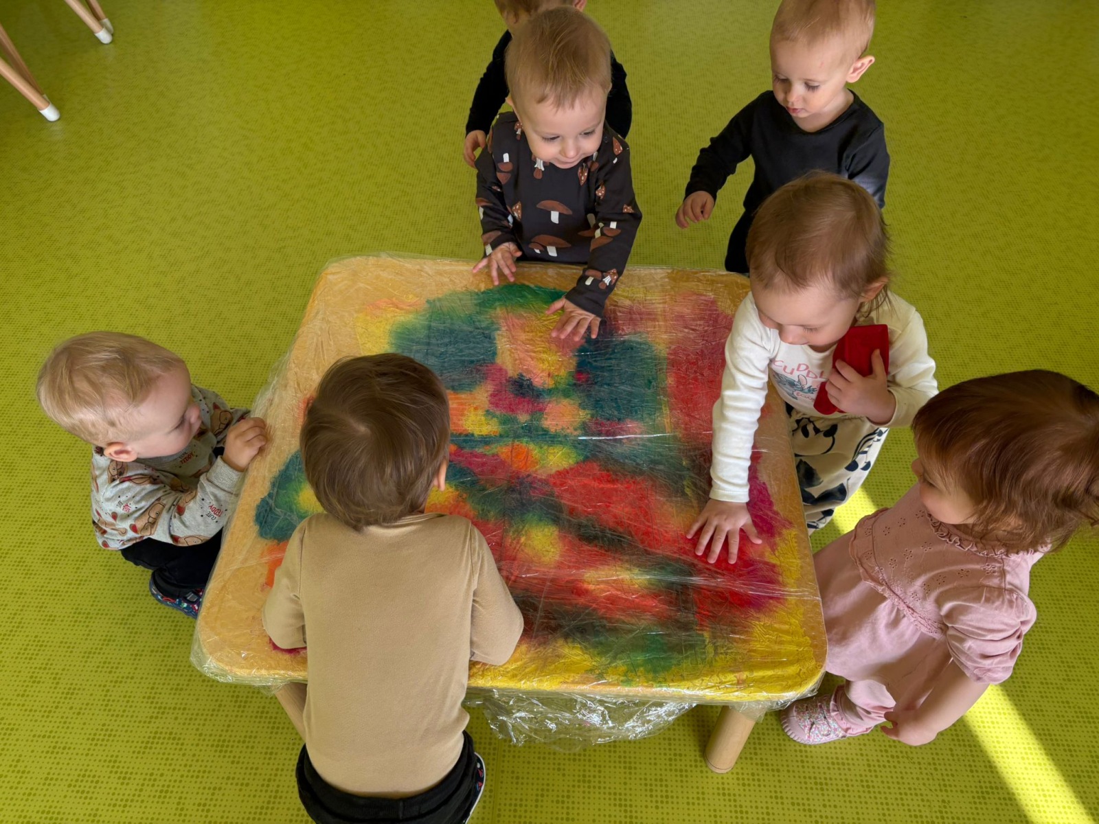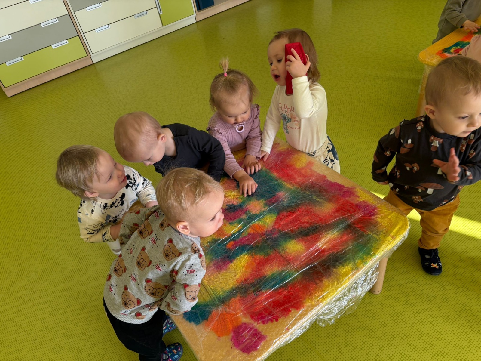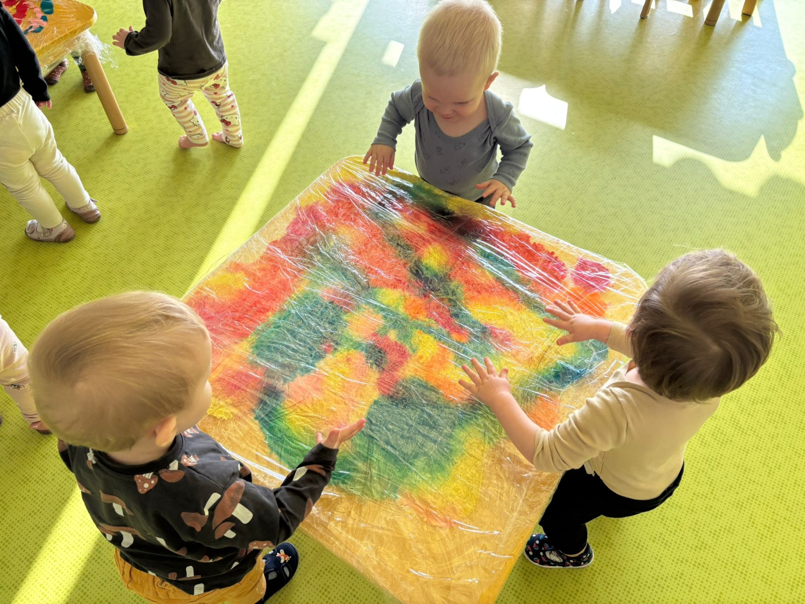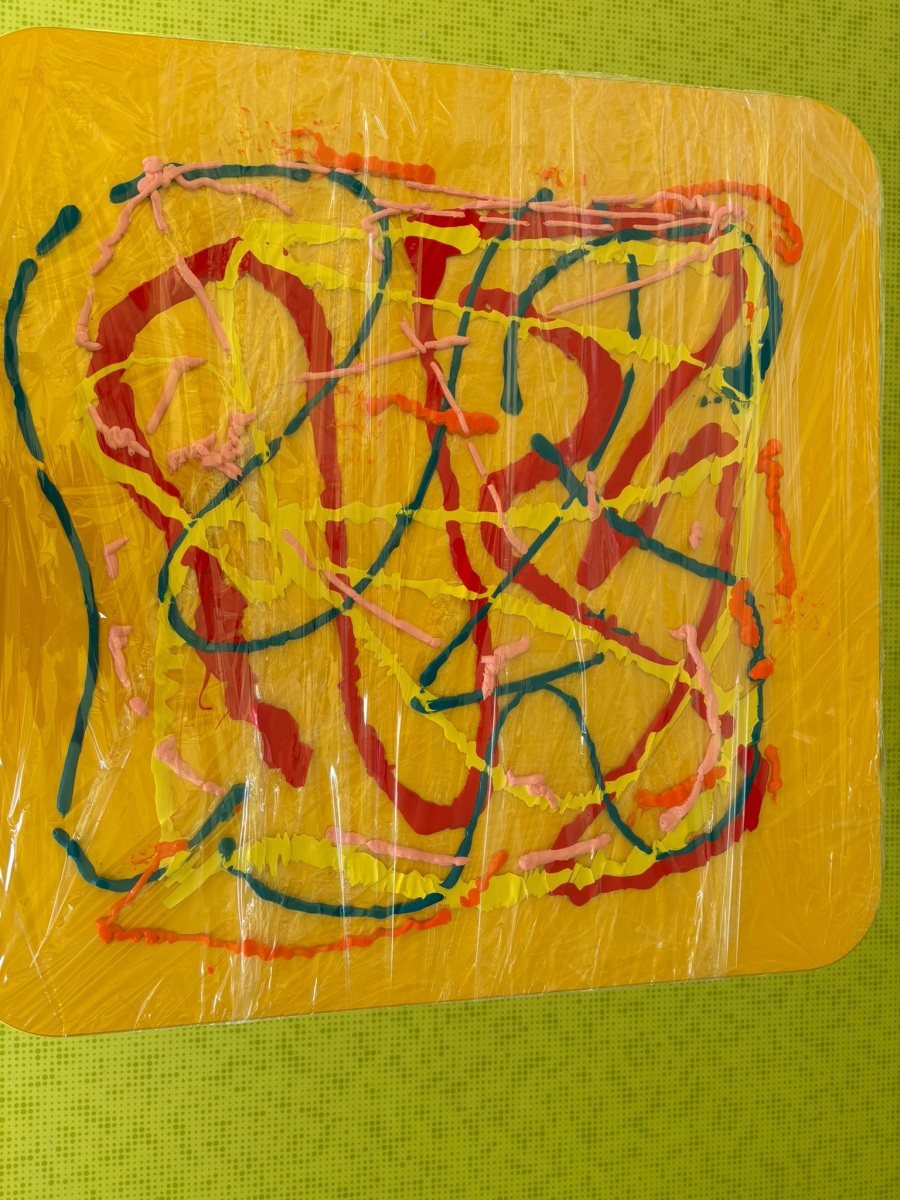 Motylki uwielbiają wyzwania i przeróżne zabawy. Tego dnia weszły na drogę kolorowego szaleństwa. Przypadkowo rozlane farby pod wpływem dziecięcej zabawy zamieniły się w niesamowitą kolorową plamę. Motylki ćwicząc swoje paluszki rozcierały, dociskały i ugniatały farbki ukryte pod folią. Ile musiały włożyć wysiłku, żeby uzyskać taki efekt… Najbardziej fascynujące dla dzieci jest tu doznawanie własnej mocy sprawczej i obserwowanie efektów działań przez przezroczystą folię. To świetna zabawa plastyczna, badawcza, sensoryczna. Dzieci badają konsystencję, miękkość i gęstość farby, dotykają gładkiej folii, obserwują  jak się marszczy, jak się łączą kolory. To była twórcza, niepowtarzalna pełna wrażeń praca, która silnie działała na zmysły naszych maluszków.