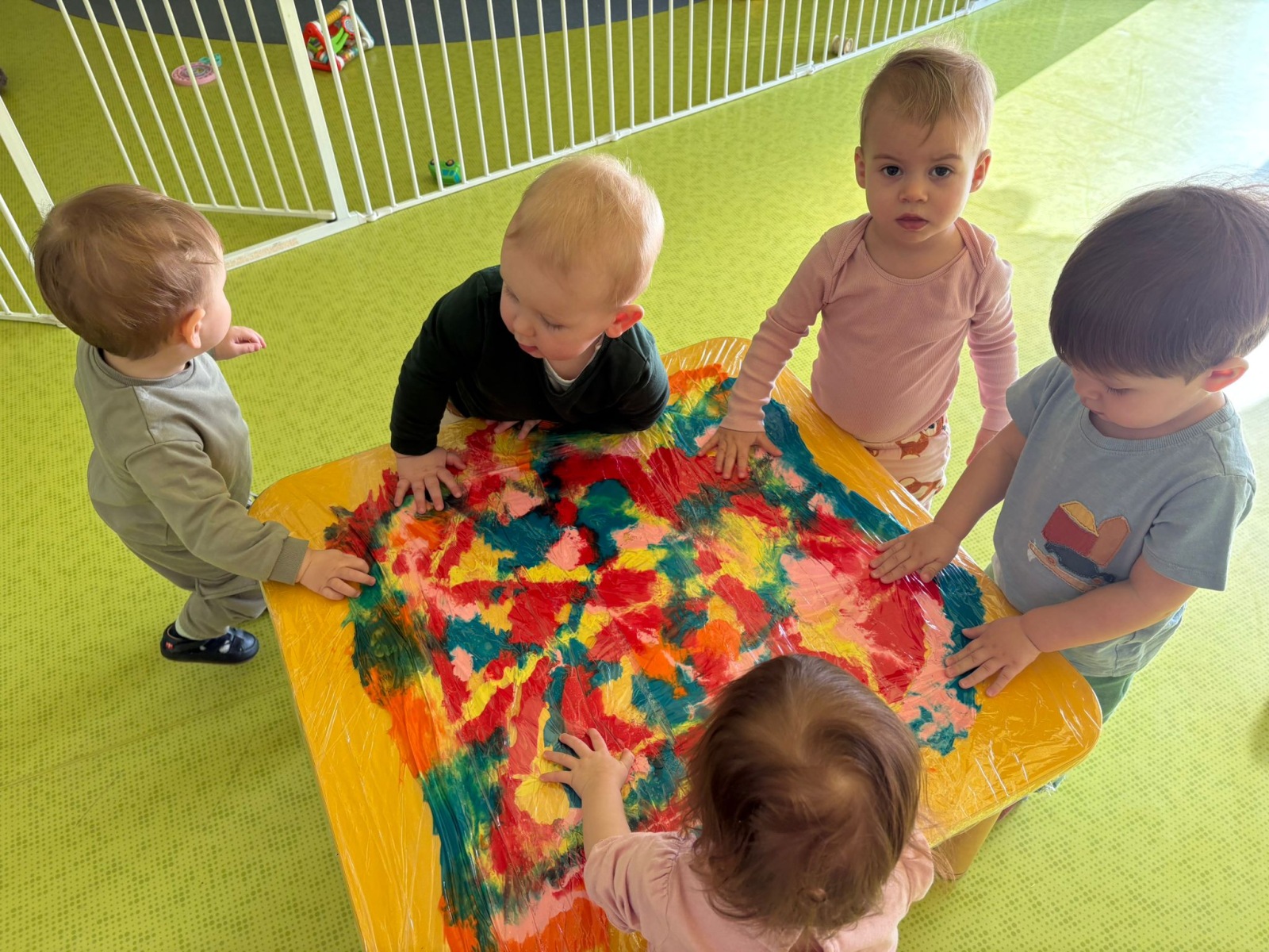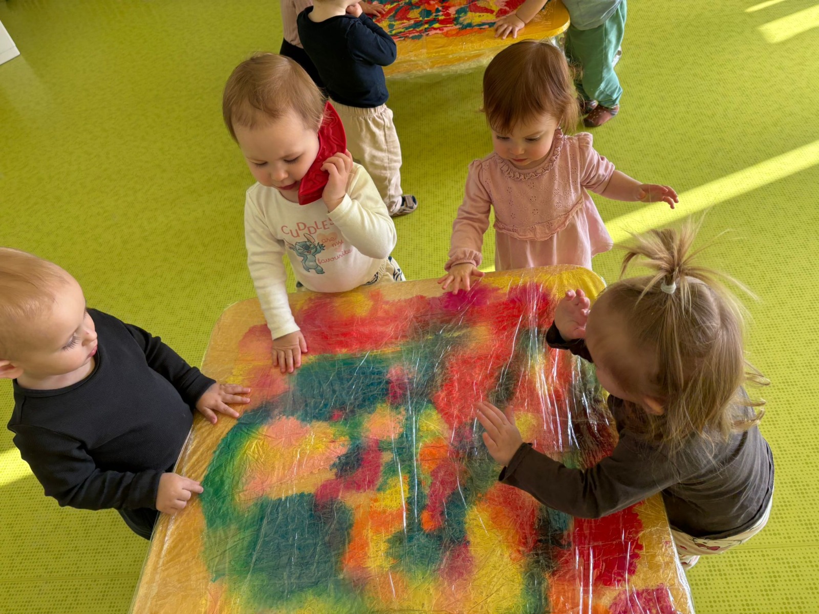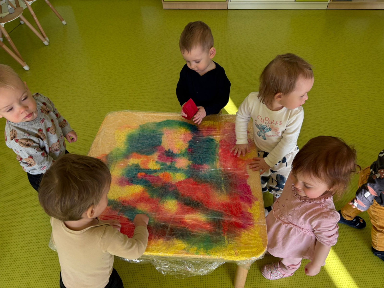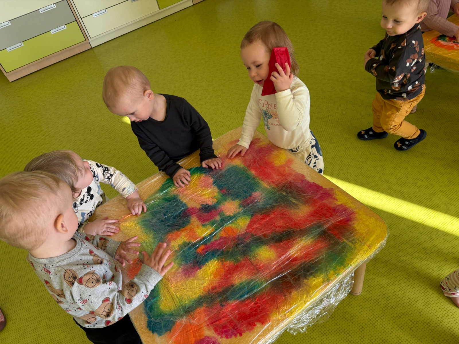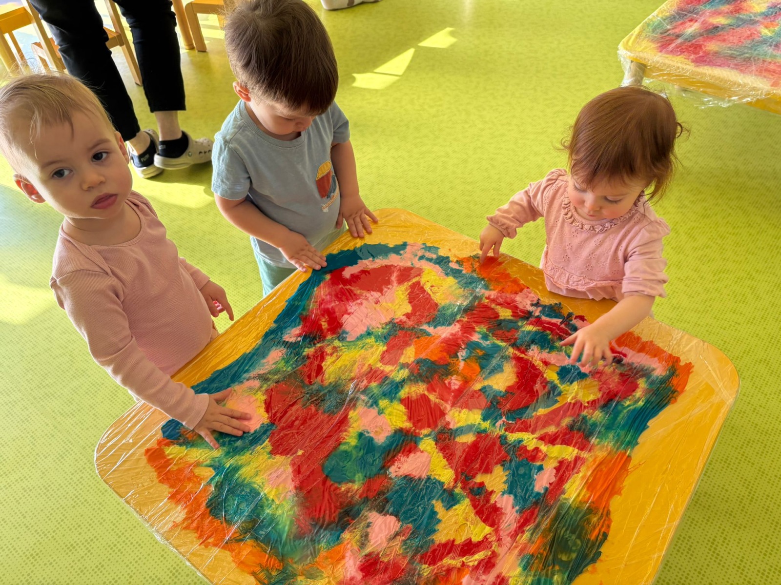 Motylki uwielbiają wyzwania i przeróżne zabawy. Tego dnia weszły na drogę kolorowego szaleństwa. Przypadkowo rozlane farby pod wpływem dziecięcej zabawy zamieniły się w niesamowitą kolorową plamę. Motylki ćwicząc swoje paluszki rozcierały, dociskały i ugniatały farbki ukryte pod folią. Ile musiały włożyć wysiłku, żeby uzyskać taki efekt… Najbardziej fascynujące dla dzieci jest tu doznawanie własnej mocy sprawczej i obserwowanie efektów działań przez przezroczystą folię. To świetna zabawa plastyczna, badawcza, sensoryczna. Dzieci badają konsystencję, miękkość i gęstość farby, dotykają gładkiej folii, obserwują  jak się marszczy, jak się łączą kolory. To była twórcza, niepowtarzalna pełna wrażeń praca, która silnie działała na zmysły naszych maluszków.