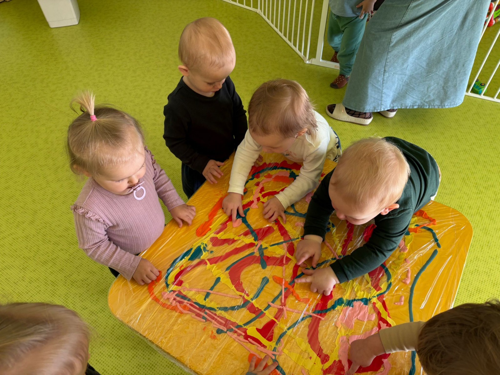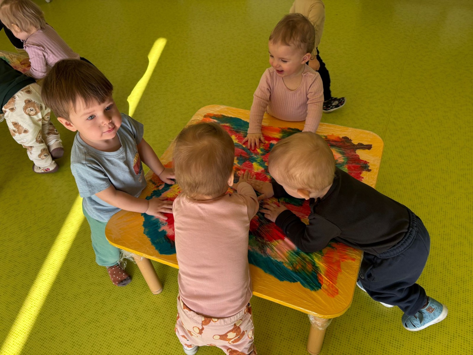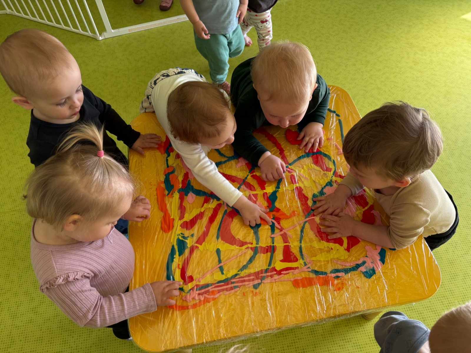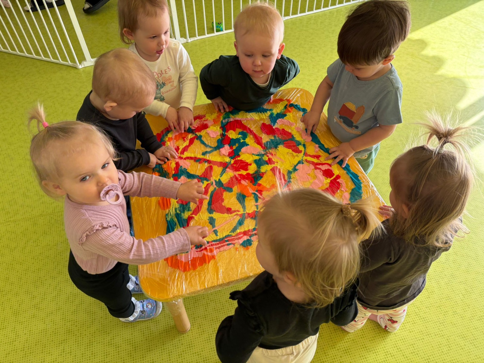 Motylki uwielbiają wyzwania i przeróżne zabawy. Tego dnia weszły na drogę kolorowego szaleństwa. Przypadkowo rozlane farby pod wpływem dziecięcej zabawy zamieniły się w niesamowitą kolorową plamę. Motylki ćwicząc swoje paluszki rozcierały, dociskały i ugniatały farbki ukryte pod folią. Ile musiały włożyć wysiłku, żeby uzyskać taki efekt… Najbardziej fascynujące dla dzieci jest tu doznawanie własnej mocy sprawczej i obserwowanie efektów działań przez przezroczystą folię. To świetna zabawa plastyczna, badawcza, sensoryczna. Dzieci badają konsystencję, miękkość i gęstość farby, dotykają gładkiej folii, obserwują  jak się marszczy, jak się łączą kolory. To była twórcza, niepowtarzalna pełna wrażeń praca, która silnie działała na zmysły naszych maluszków.