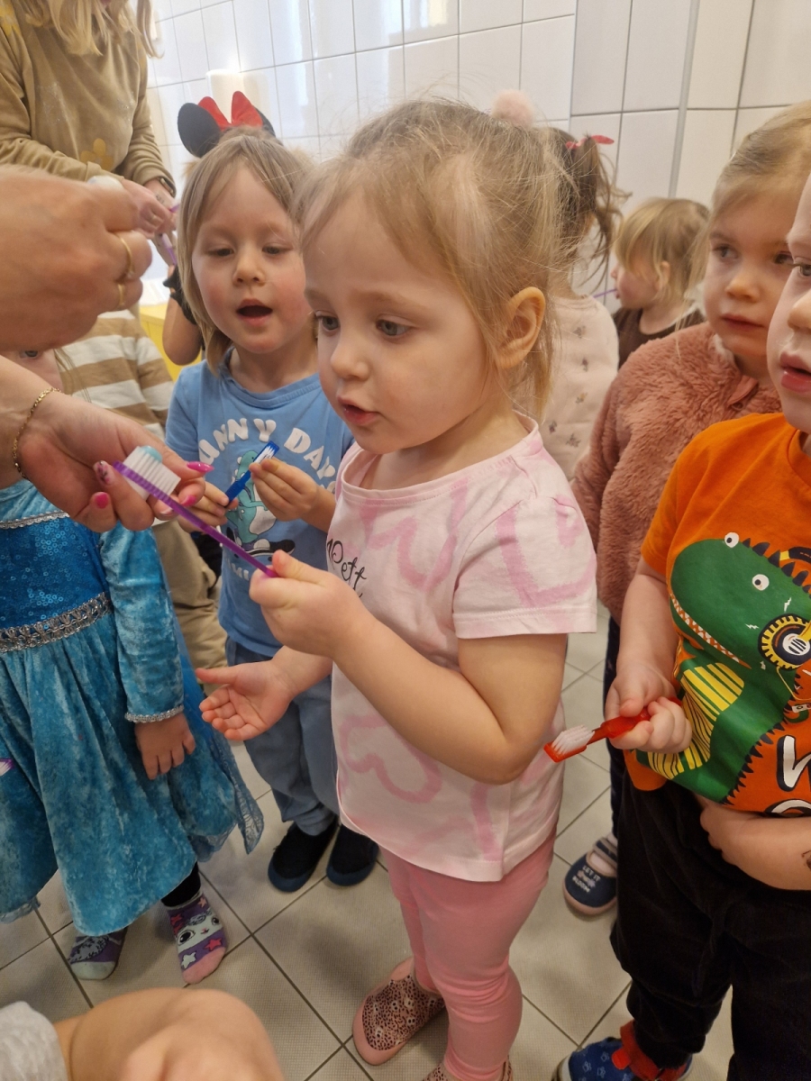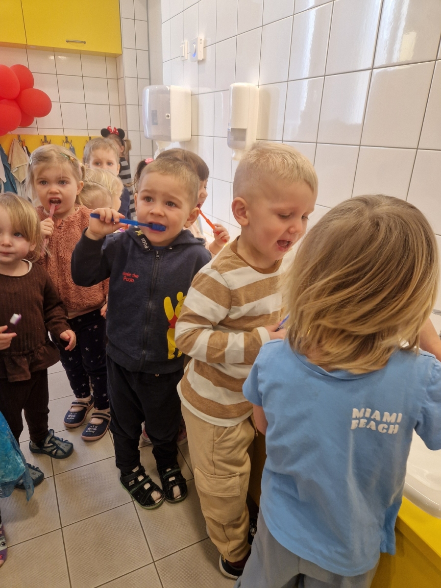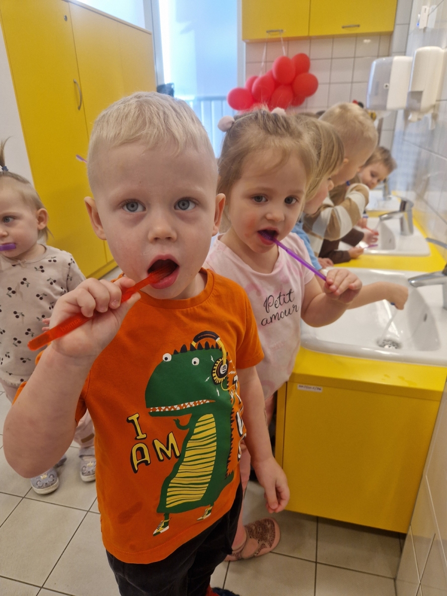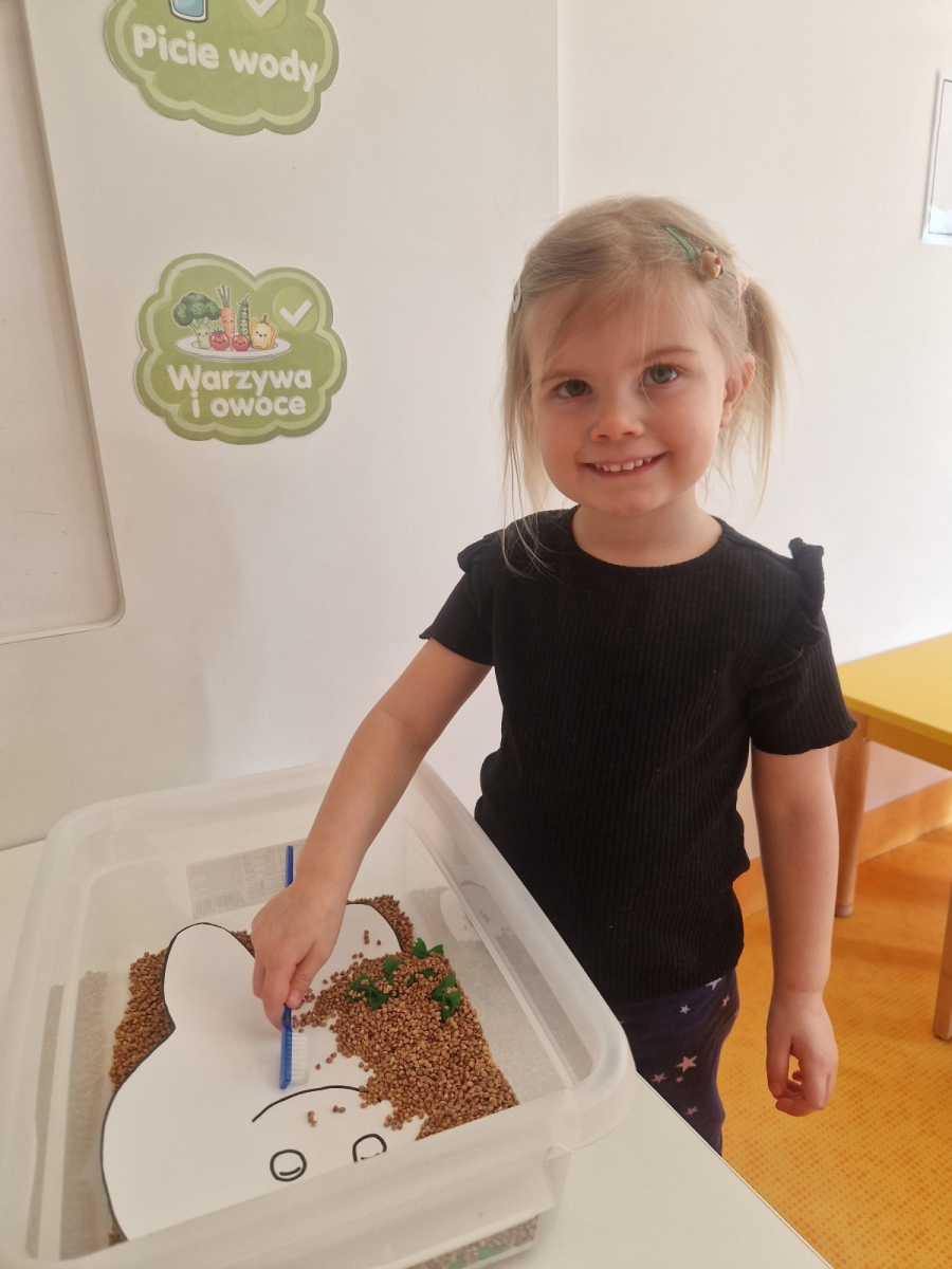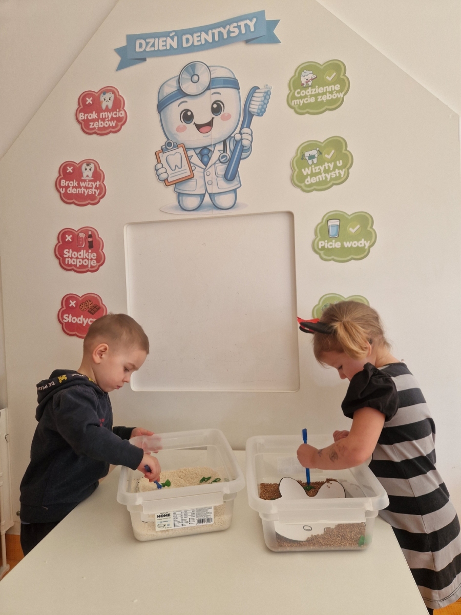 Dziś dowiedzieliśmy się co lubią nasze ząbki, a czego lepiej unikać. Jak prawidłowo używać szczoteczki i pasty, następnie myliśmy ząbki. Oczyszczaliśmy ząbki z bakterii za pomocą dużego zęba posypanego ryżem i kaszą. teraz każdy pacjent wie co jest dobre dla jego ząbków, a co nie.