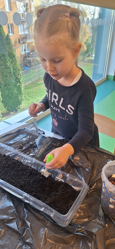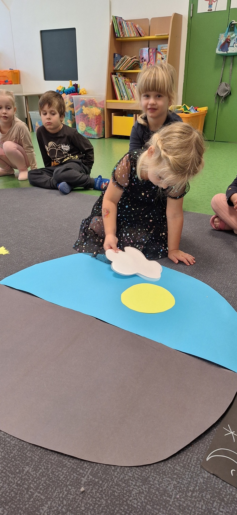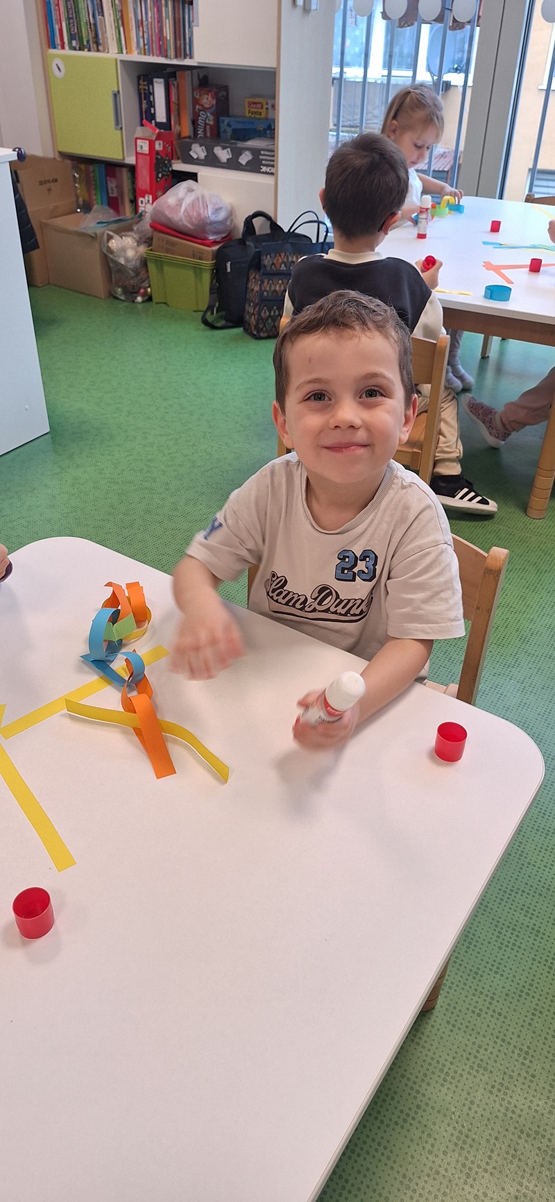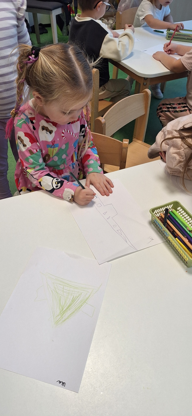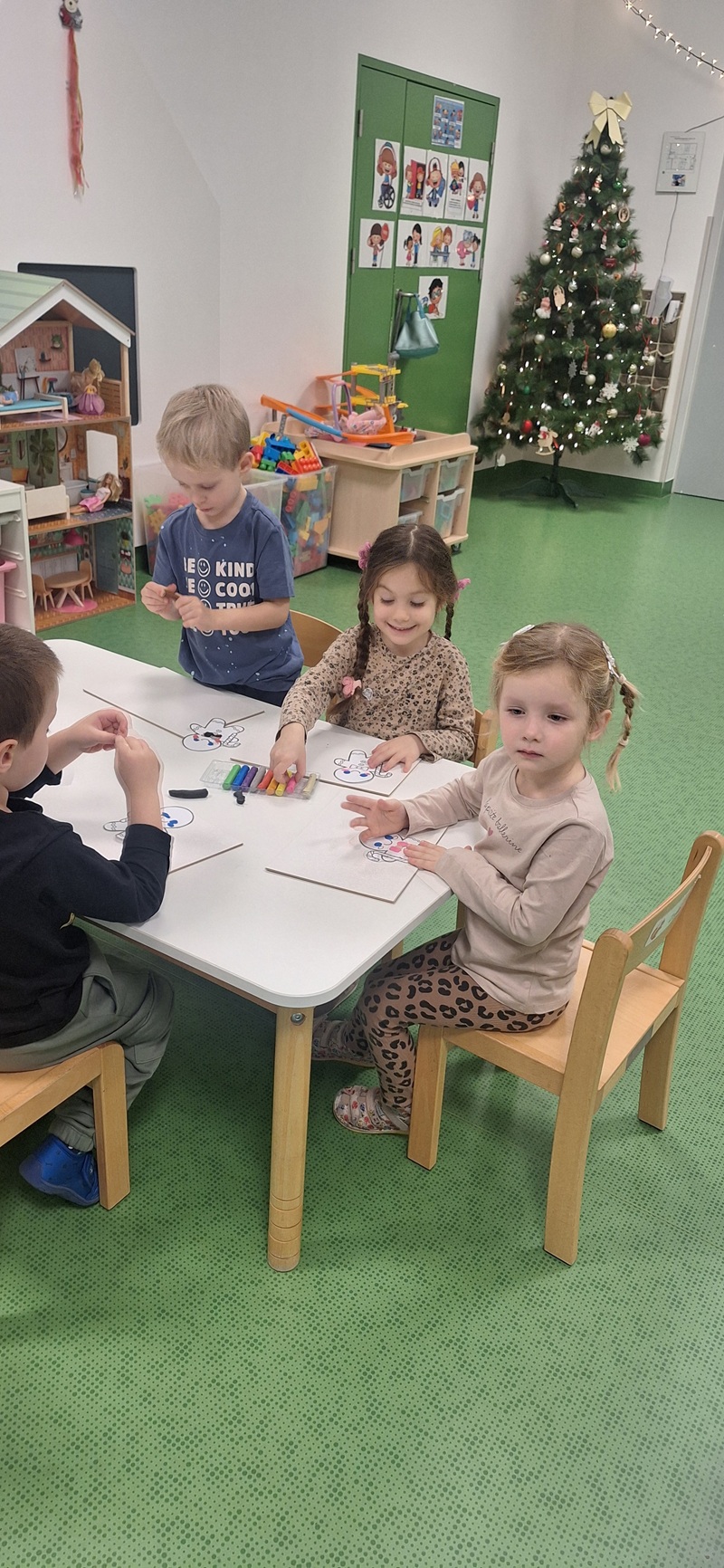 Następnie dzieci malowały zimowy krajobraz pod folią. Malowanie pod folią to niezwykła zabawa plastyczna dla dzieci. Najbardziej interesujące jest tu doznawanie własnej mocy sprawczej i obserwowanie efektów działań przez przezroczystą folię. To świetna zabawa plastyczna, badawcza, sensoryczna i terapeutyczna.