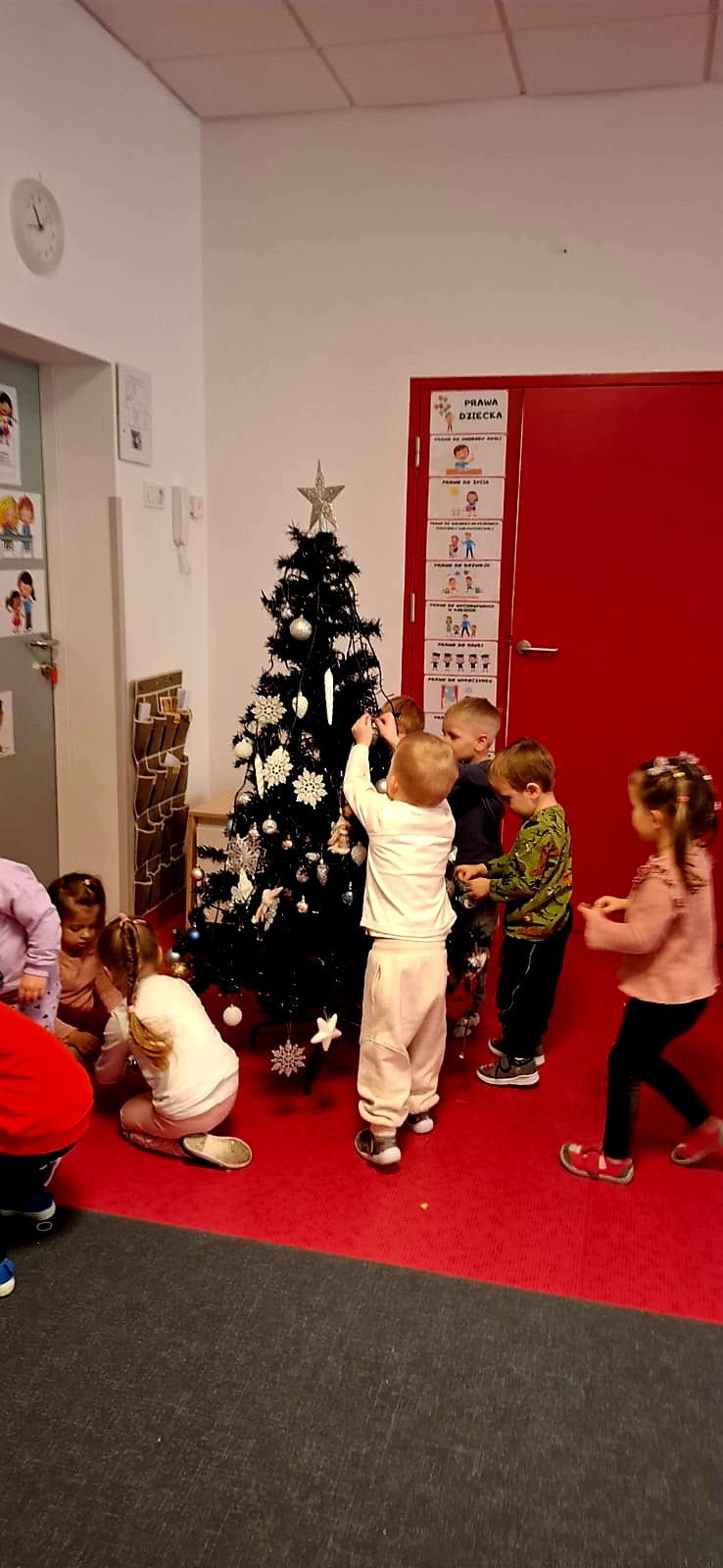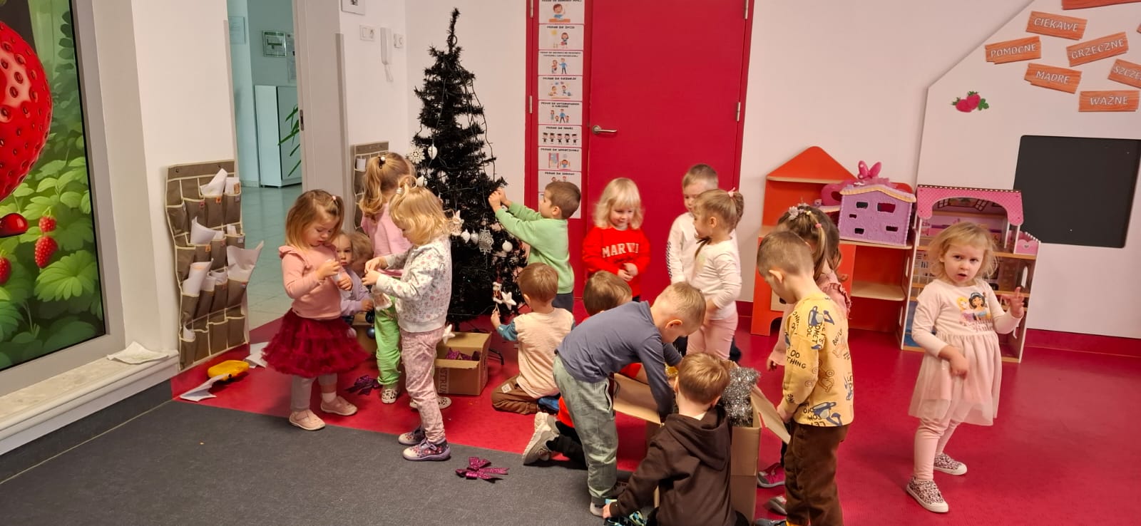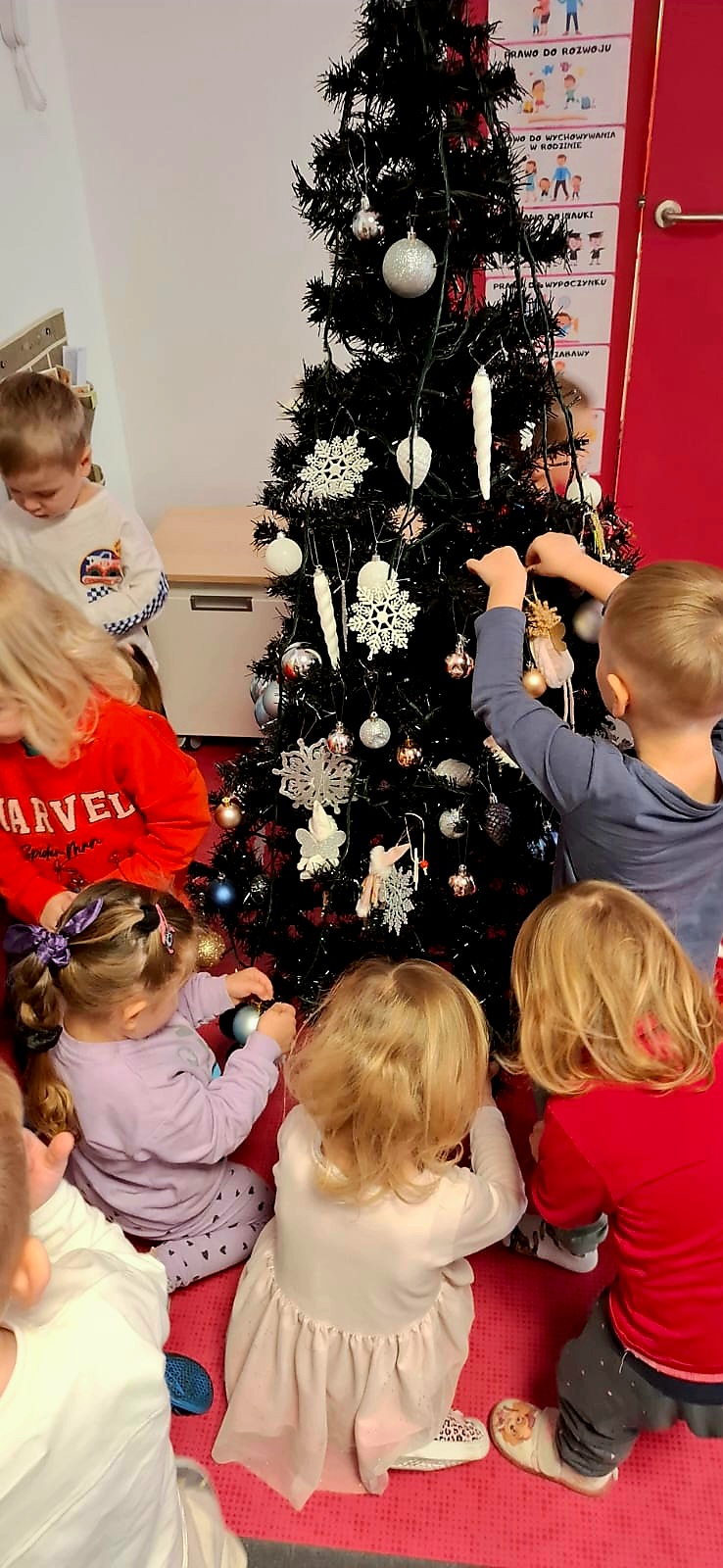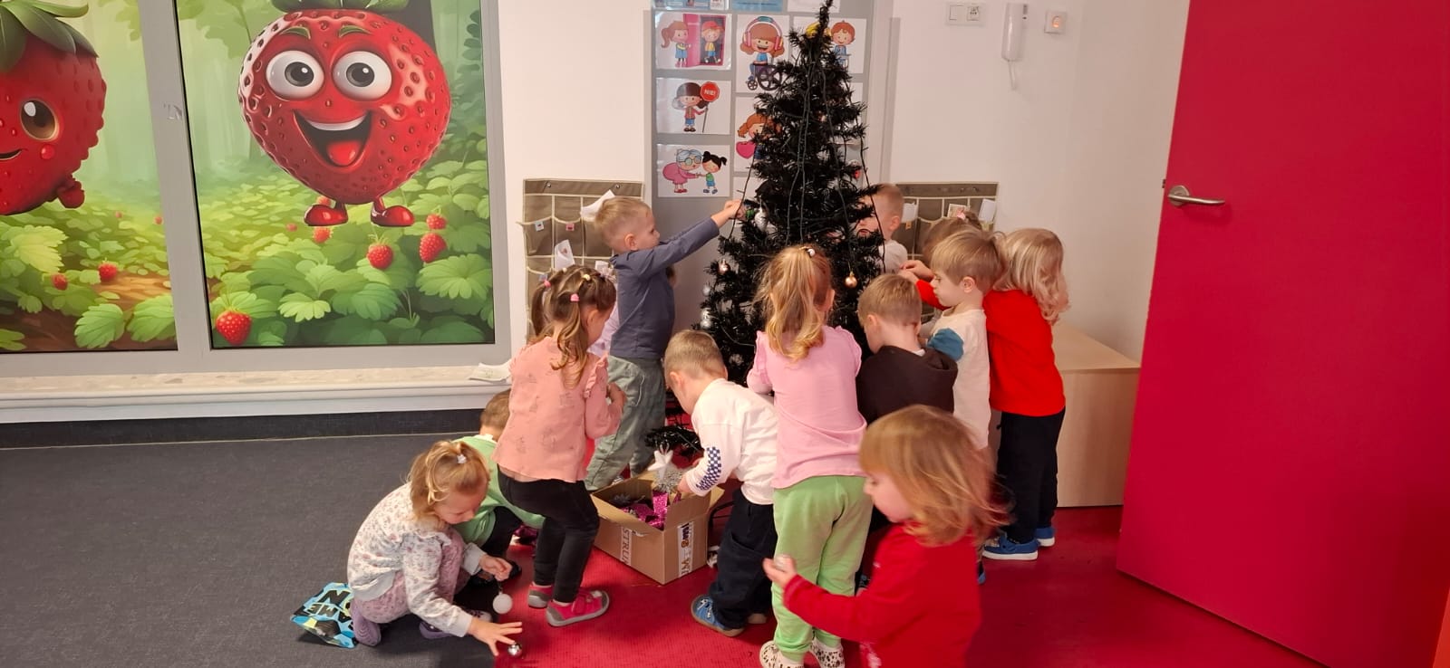 Ubieranie choinki- to moment na który z niecierpliwością czekały poziomki. Dzieci z zapałem przystąpiły do zawieszania na gałązkach ozdób oraz kolorowych lampek. Przystrojona choinka wygląda zjawiskowo- rozświetliła Naszą salę.