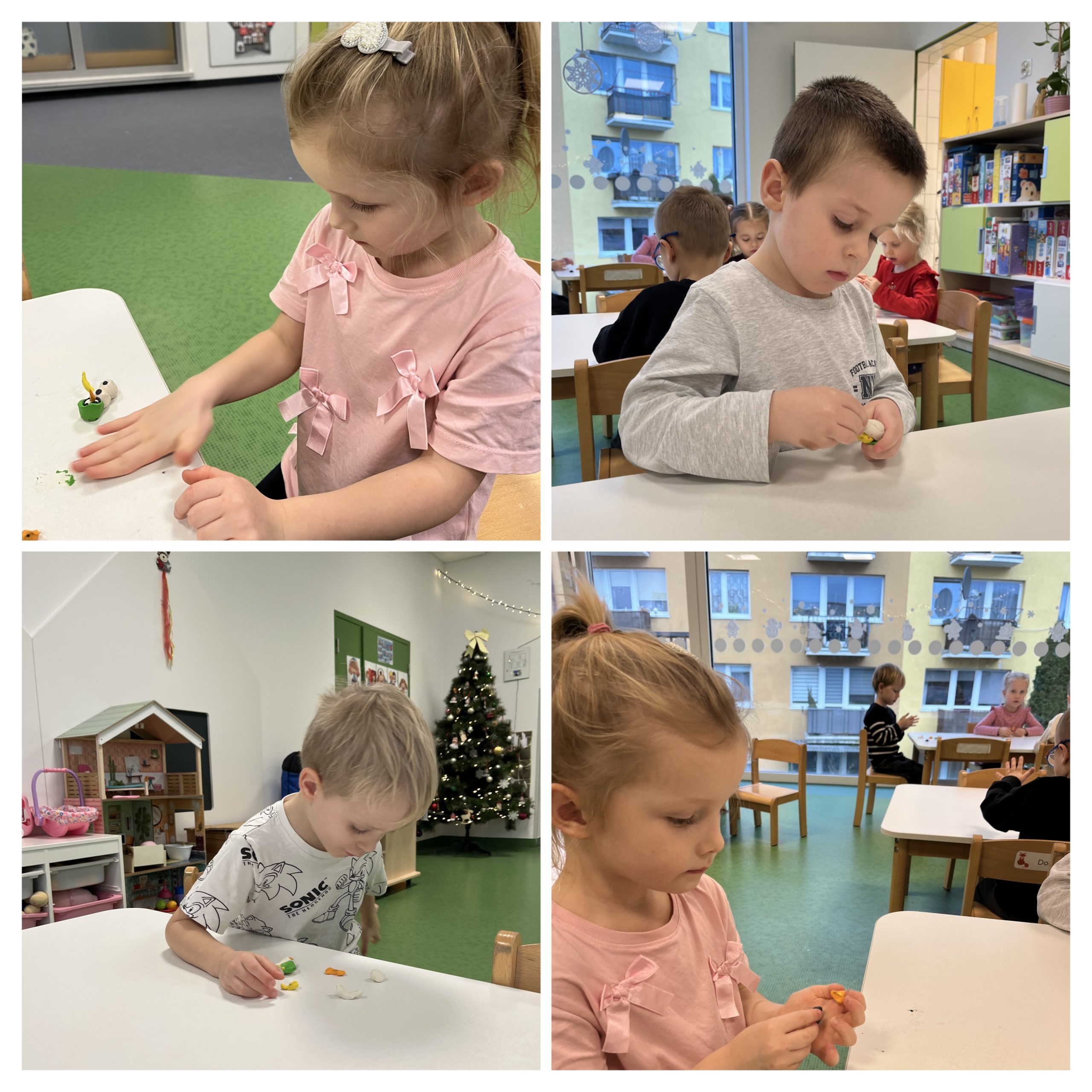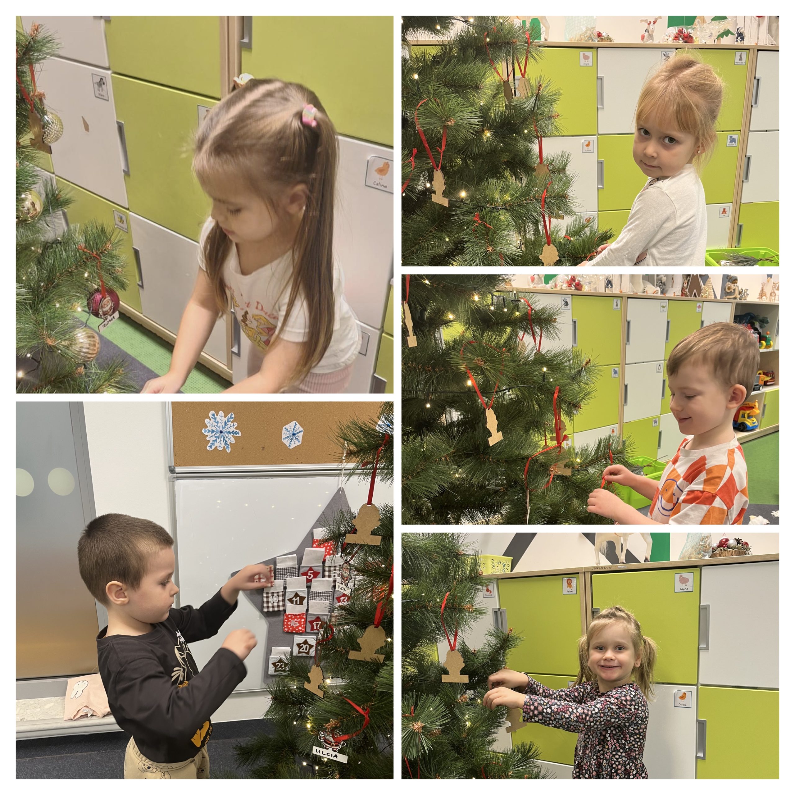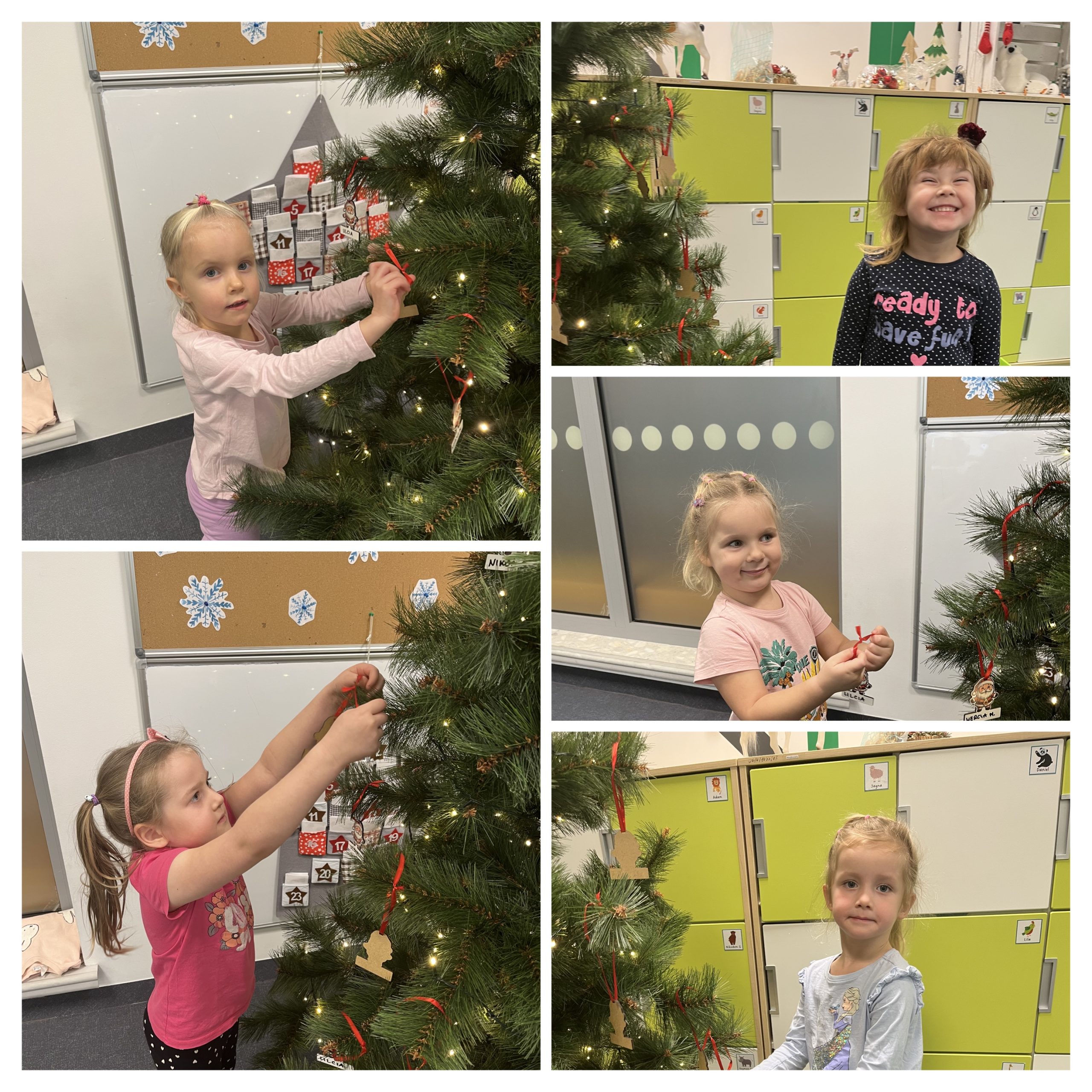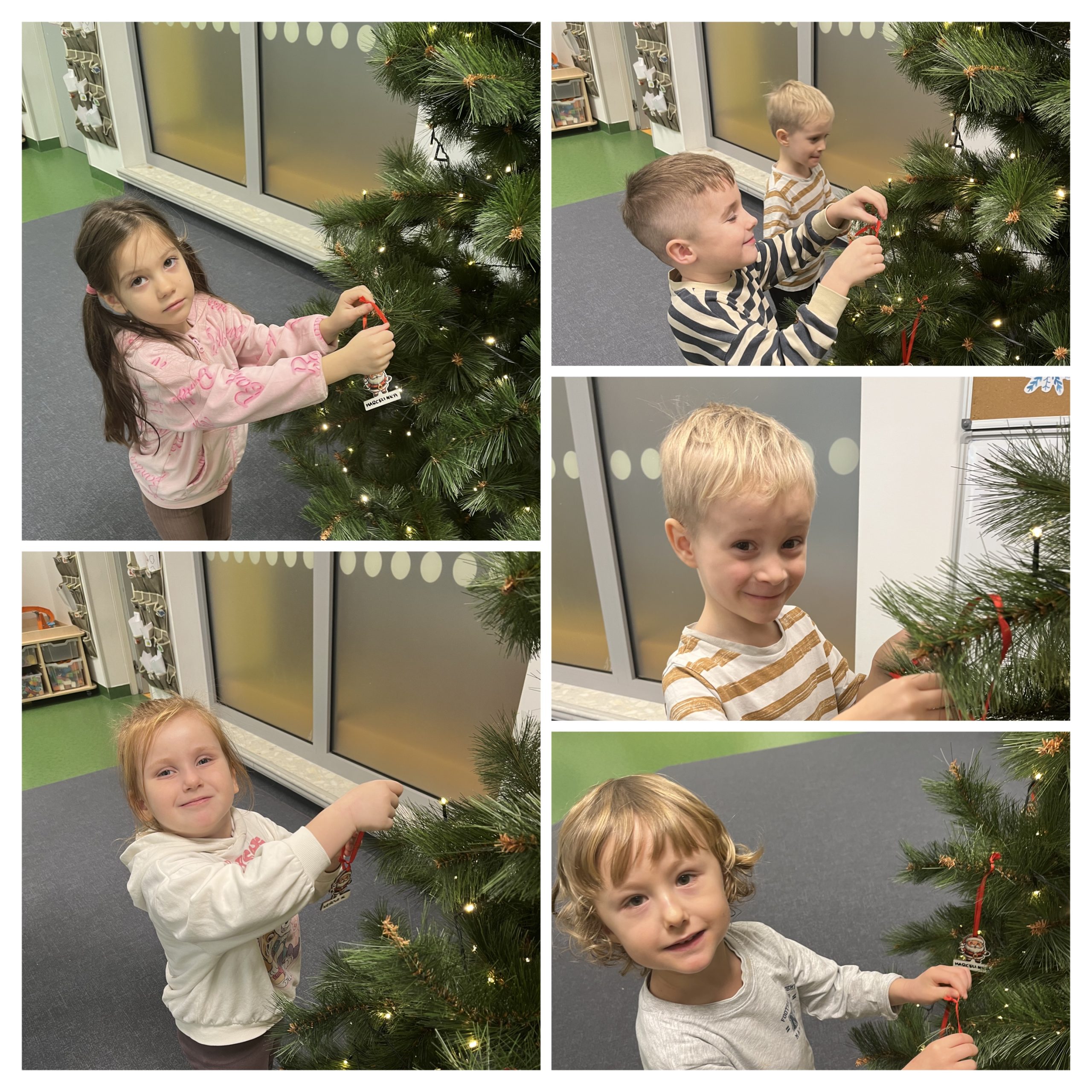 Ubieranie choinki- to moment na który z niecierpliwością czekały poziomki. Dzieci z zapałem przystąpiły do zawieszania na gałązkach ozdób oraz kolorowych lampek. Przystrojona choinka wygląda zjawiskowo- rozświetliła Naszą salę.