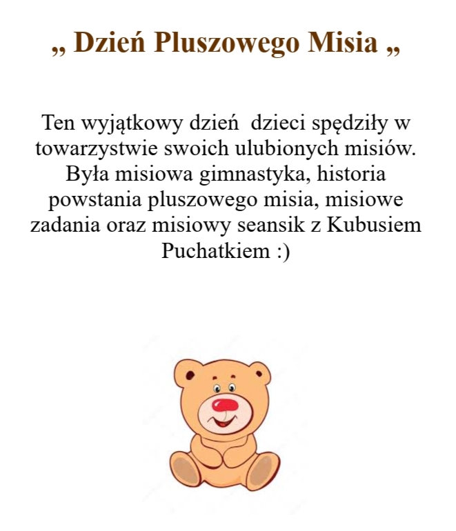 24 listopada w grupie Jeżynek obchodziliśmy Dzień Pluszowego Misia. Z tej okazji dzieci przyniosły do przedszkola, swoje ulubione maskotki misiów i razem z nimi wysłuchały opowieści o historii powstania pierwszego pluszowego misia.