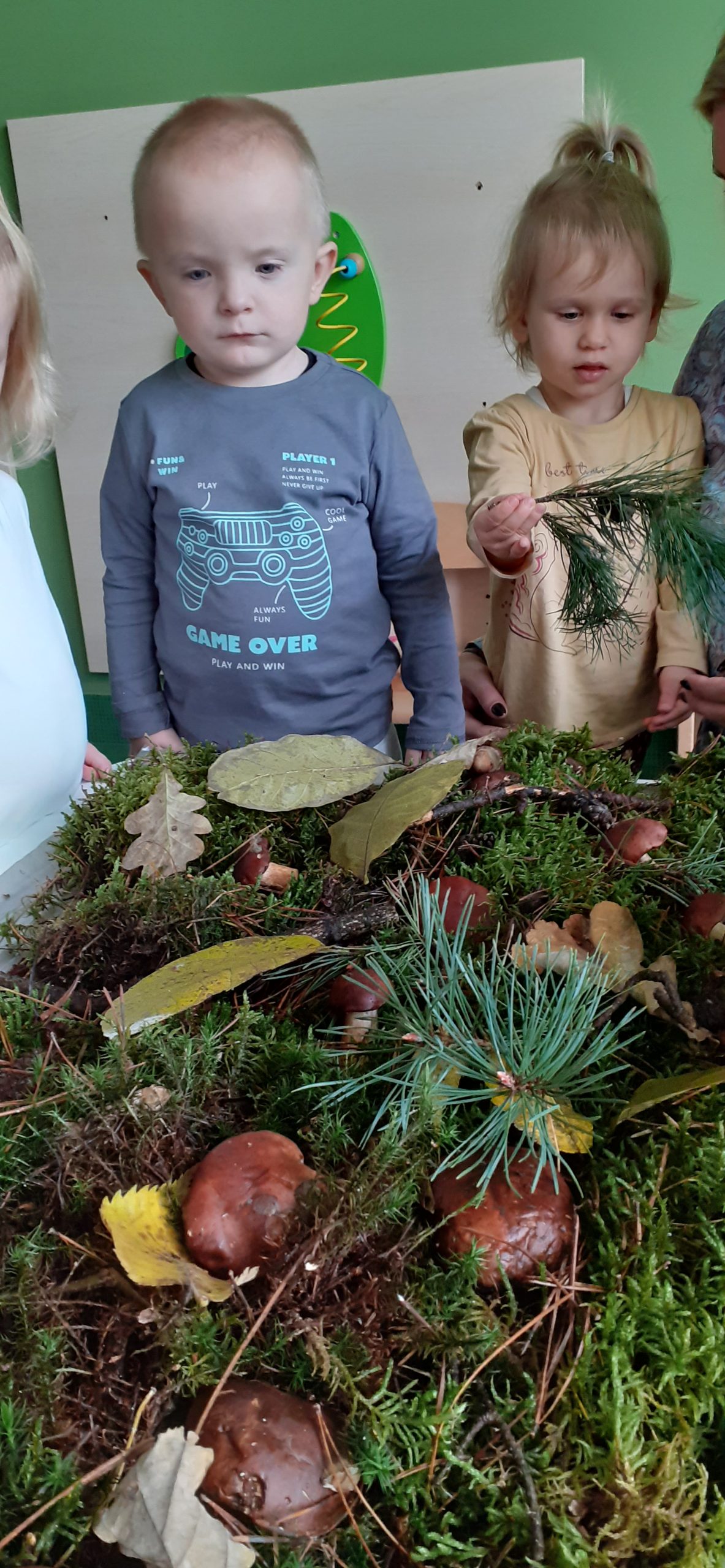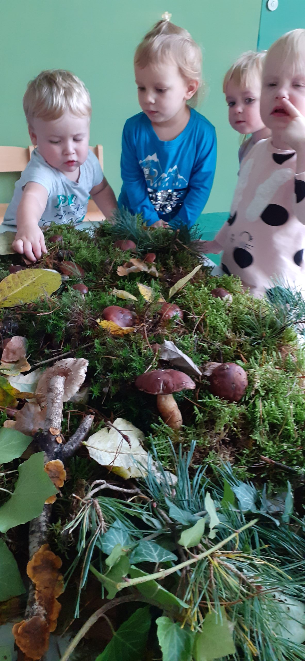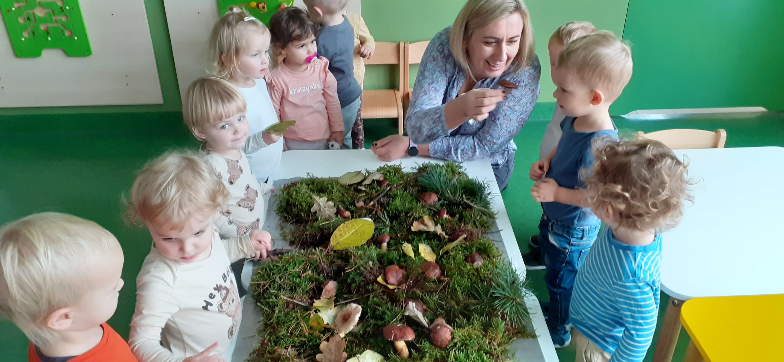 W poniedziałek Biedroneczki miały okazję zapoznać się za pomocą wszystkich zmysłów z naturalnym pięknem runa leśnego. Każdy mógł dotknąć, powąchać, zobaczyć mech, szyszki, grzyby podgrzybki, gałązki i liście.