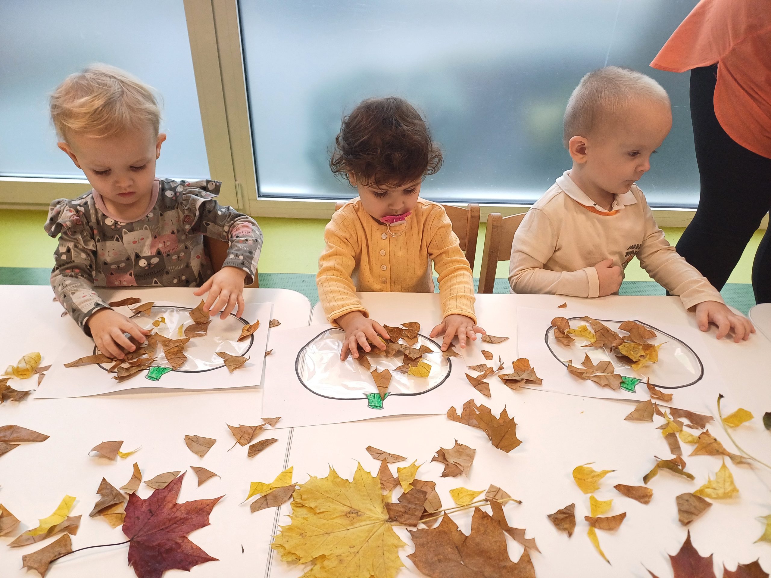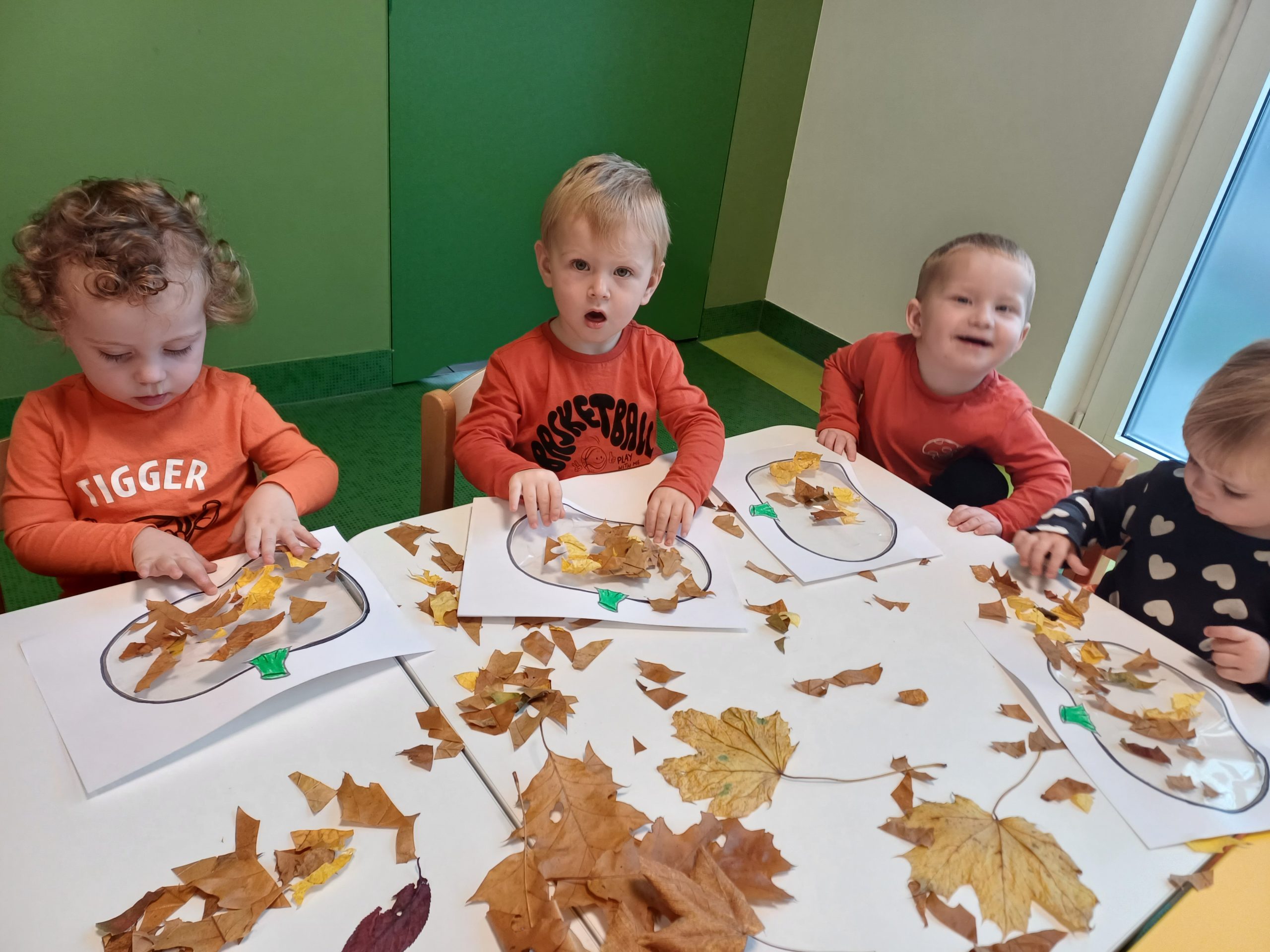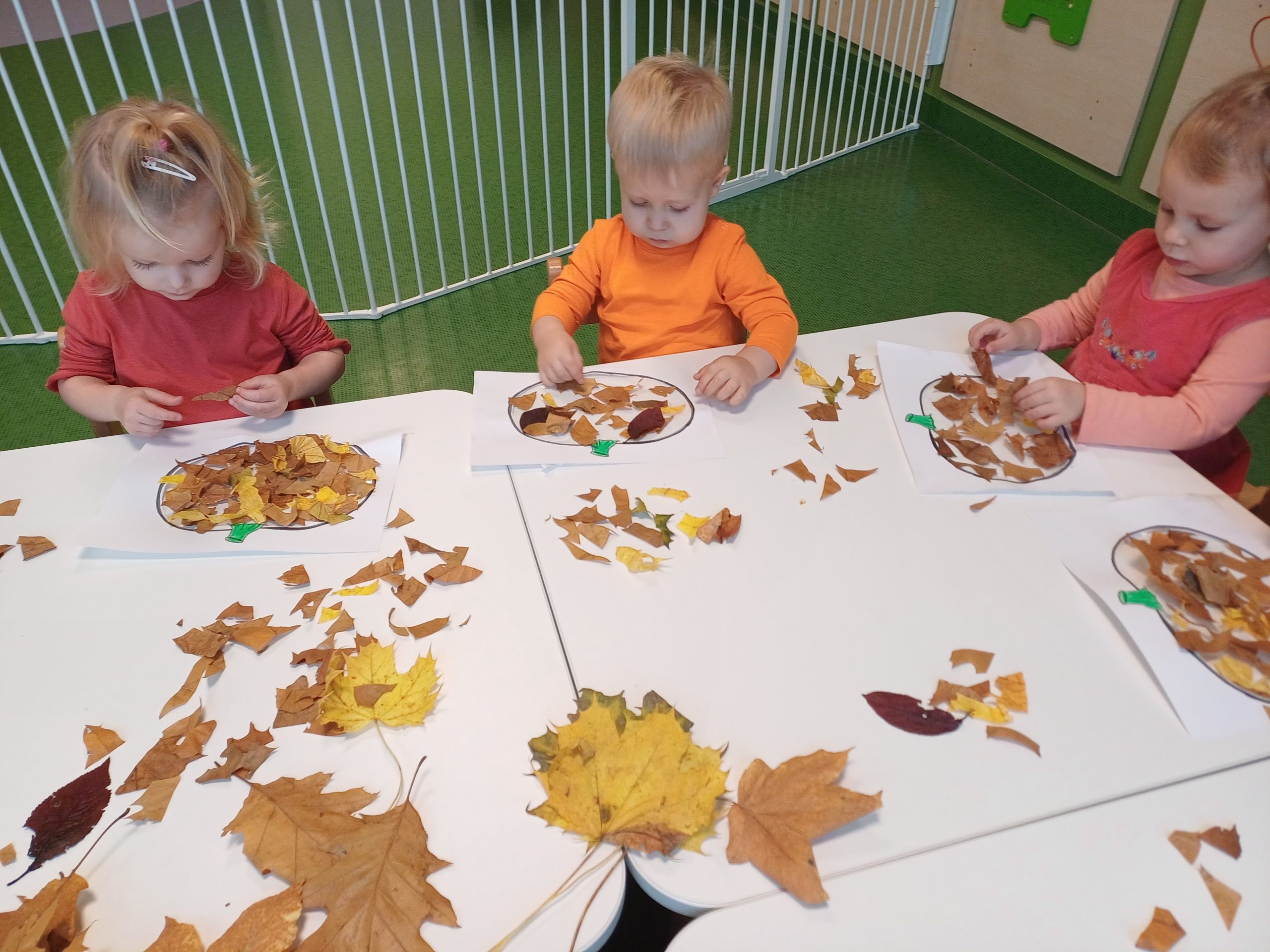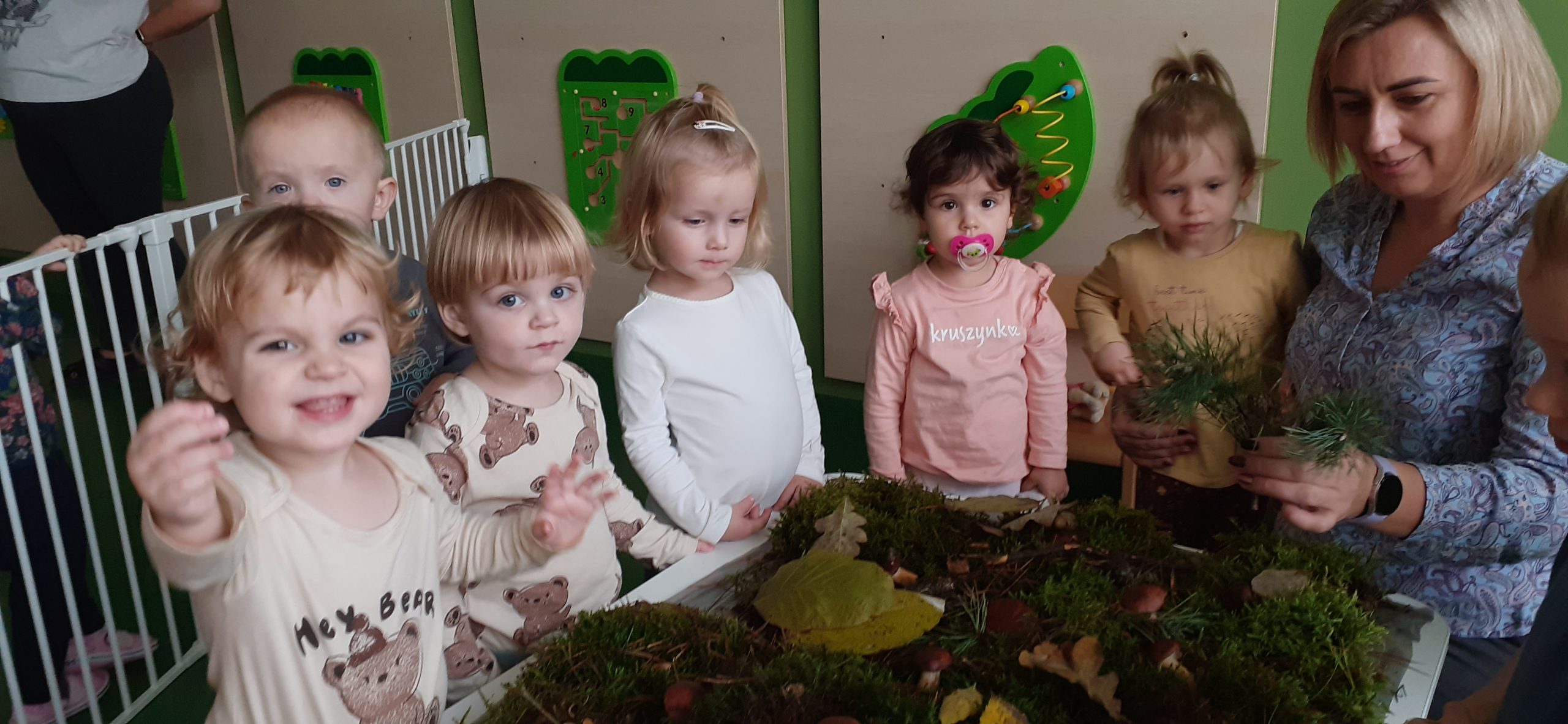 W naszej sali pojawił się dziś kawałek jesiennego lasu. Ciekawskie Pszczółki rozpoznawały dary jesieni za pomocą dotyku i węchu co sprawiło im wiele radości.