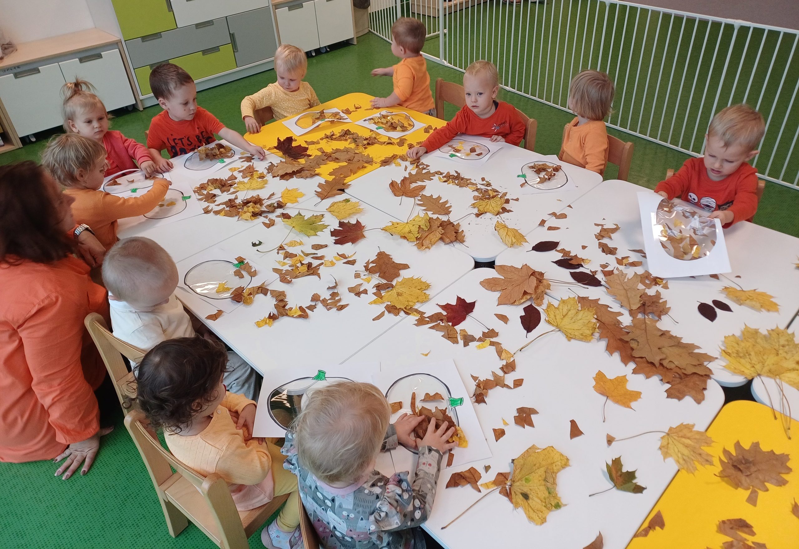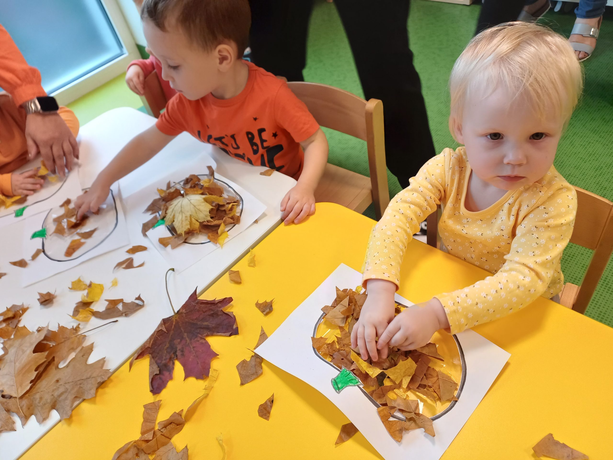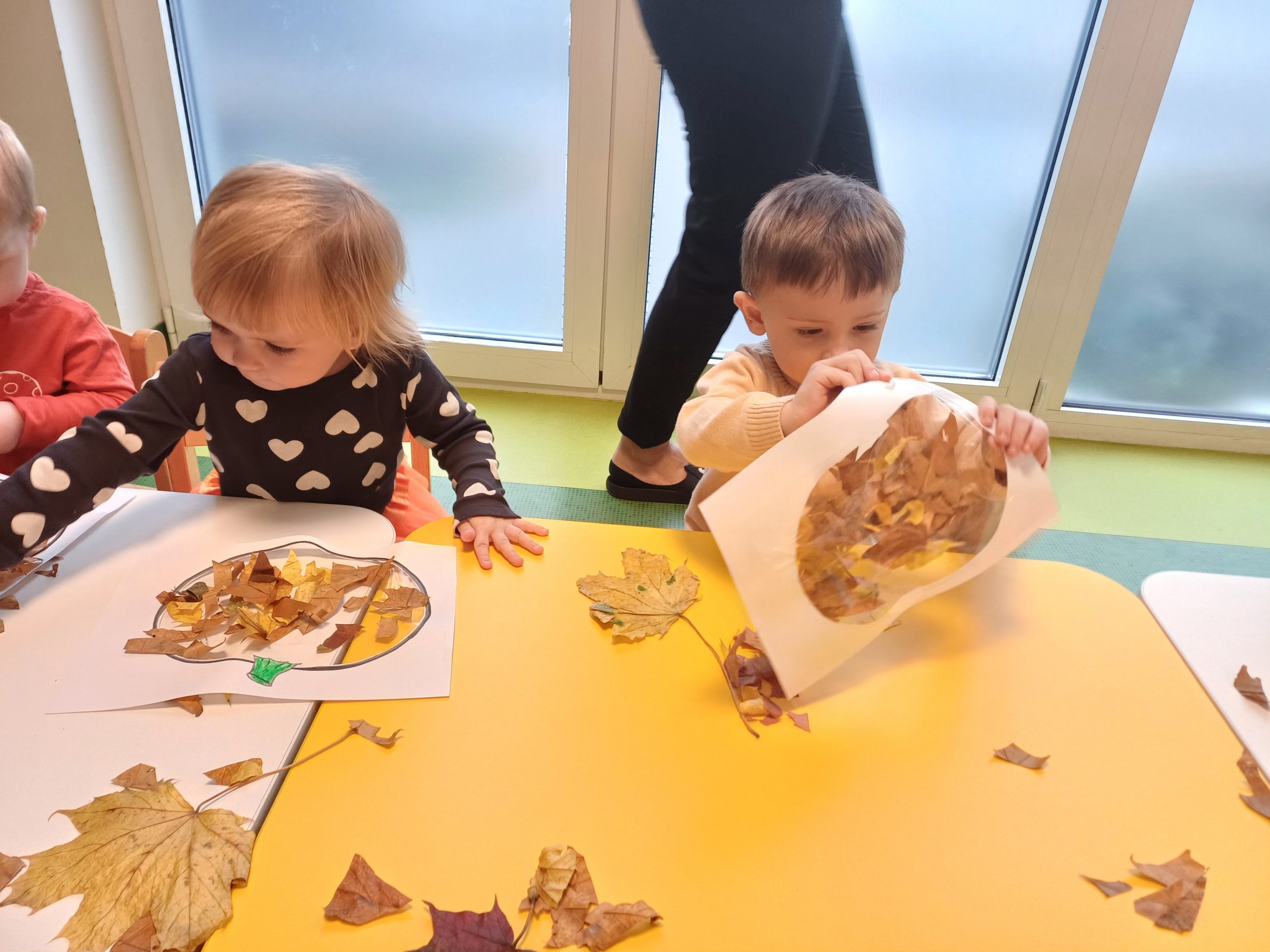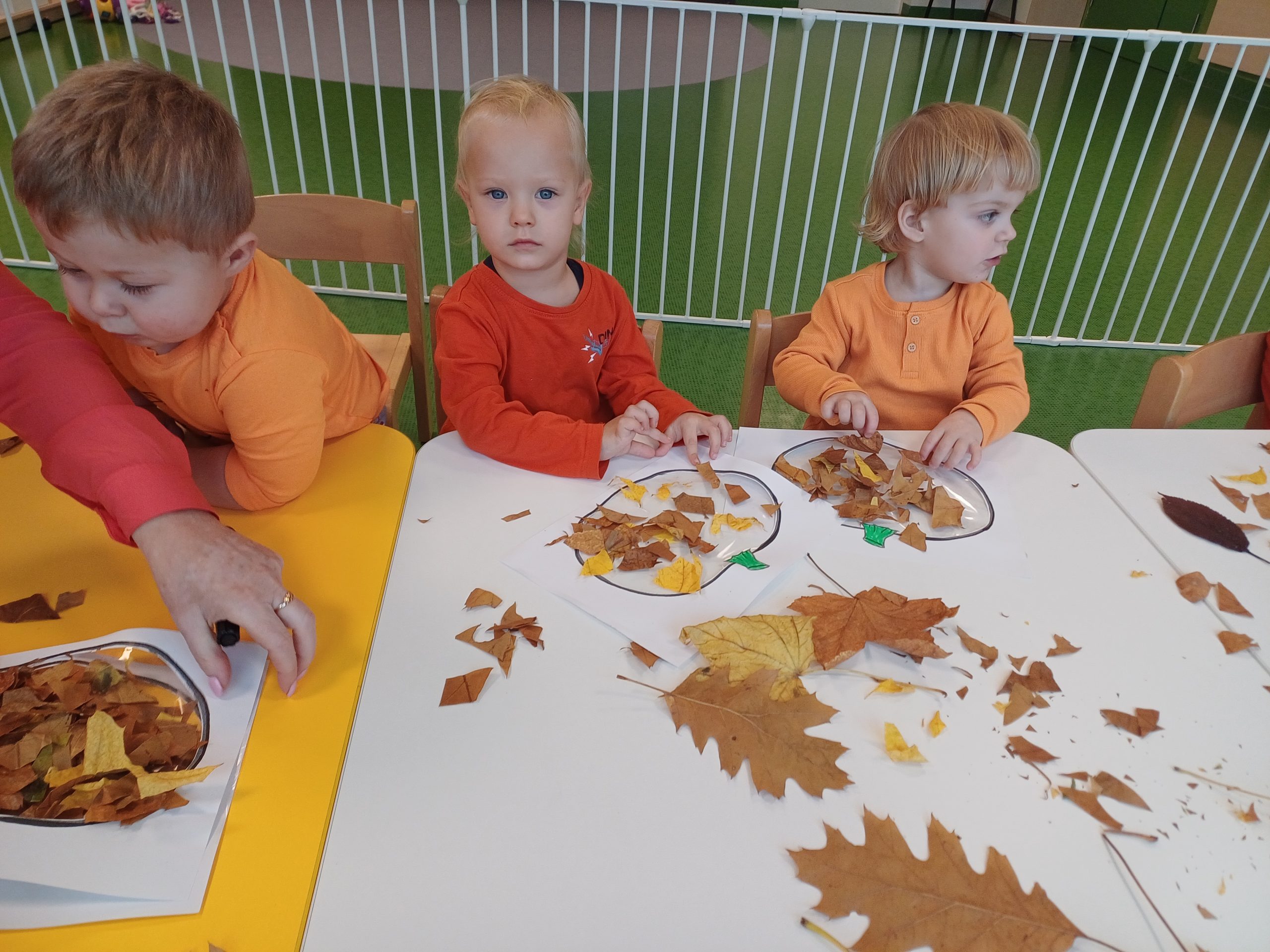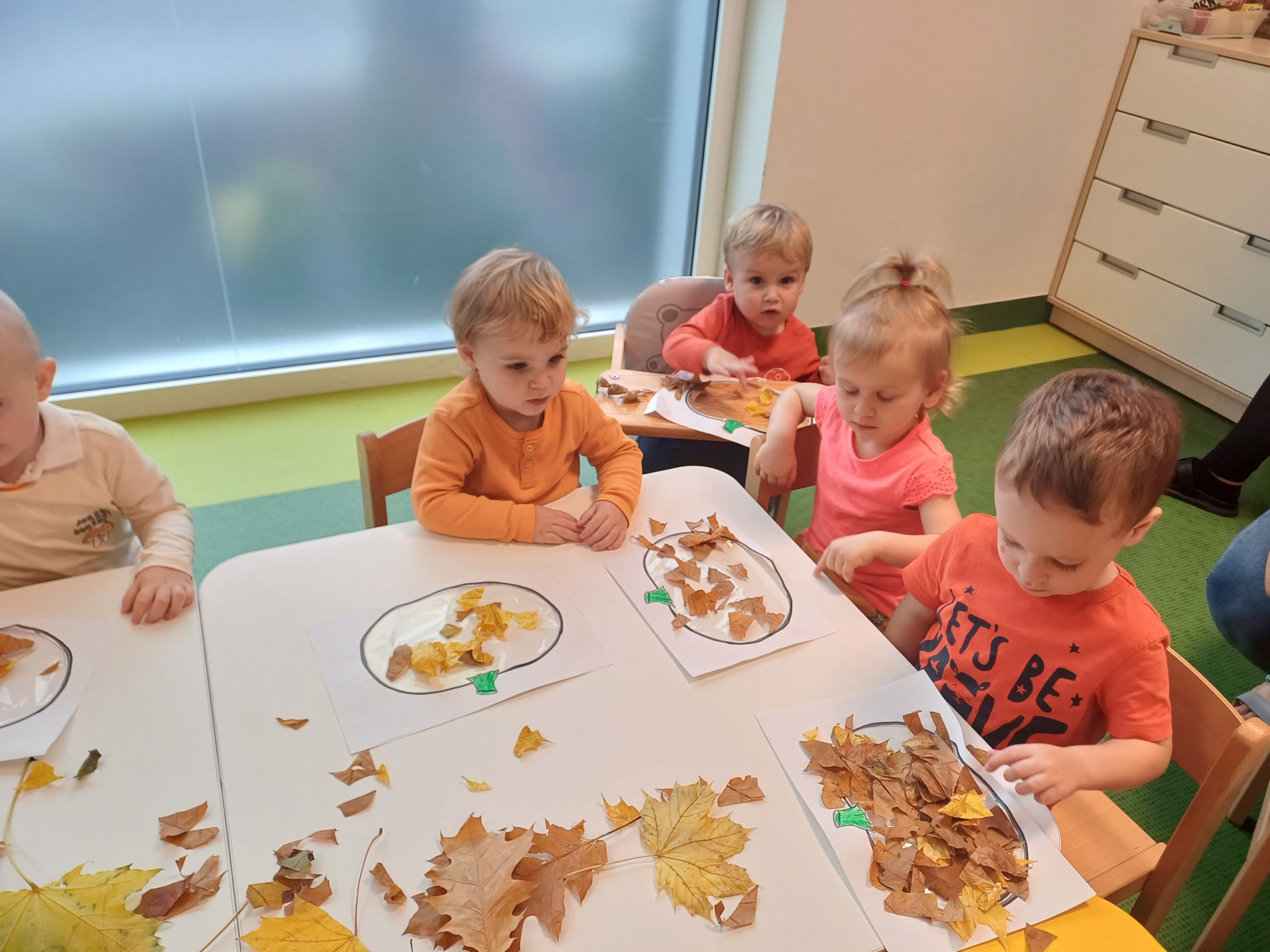 W naszej sali pojawił się dziś kawałek jesiennego lasu. Ciekawskie Pszczółki rozpoznawały dary jesieni za pomocą dotyku i węchu co sprawiło im wiele radości.