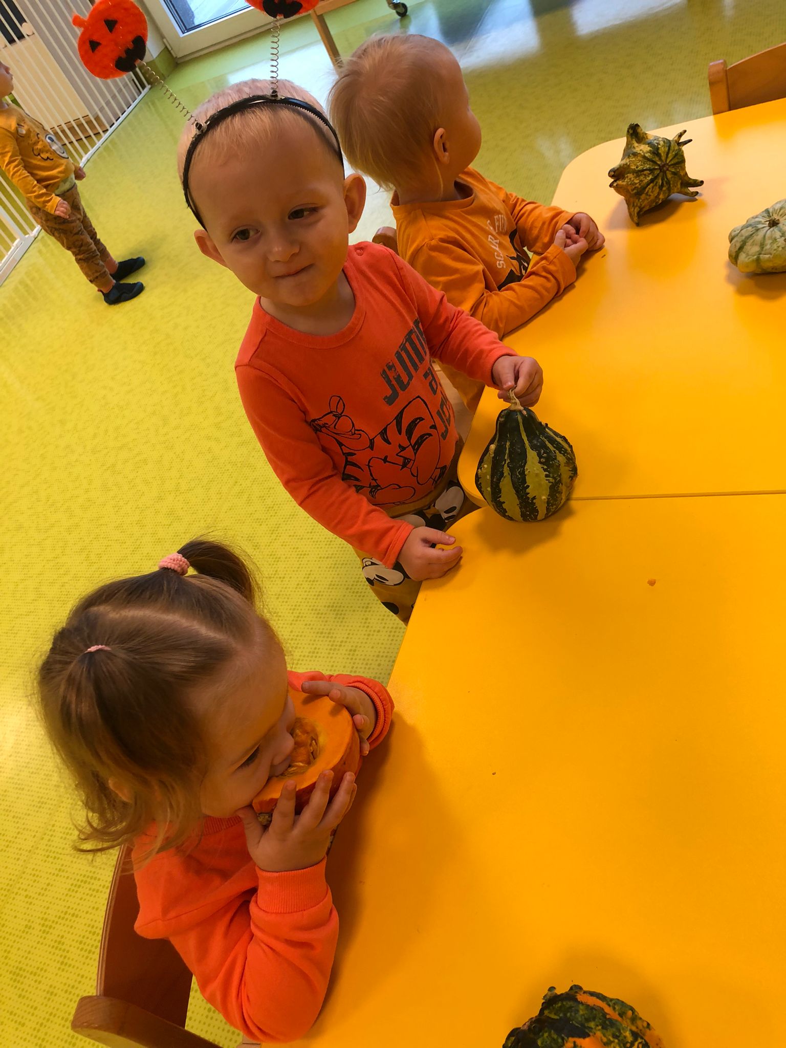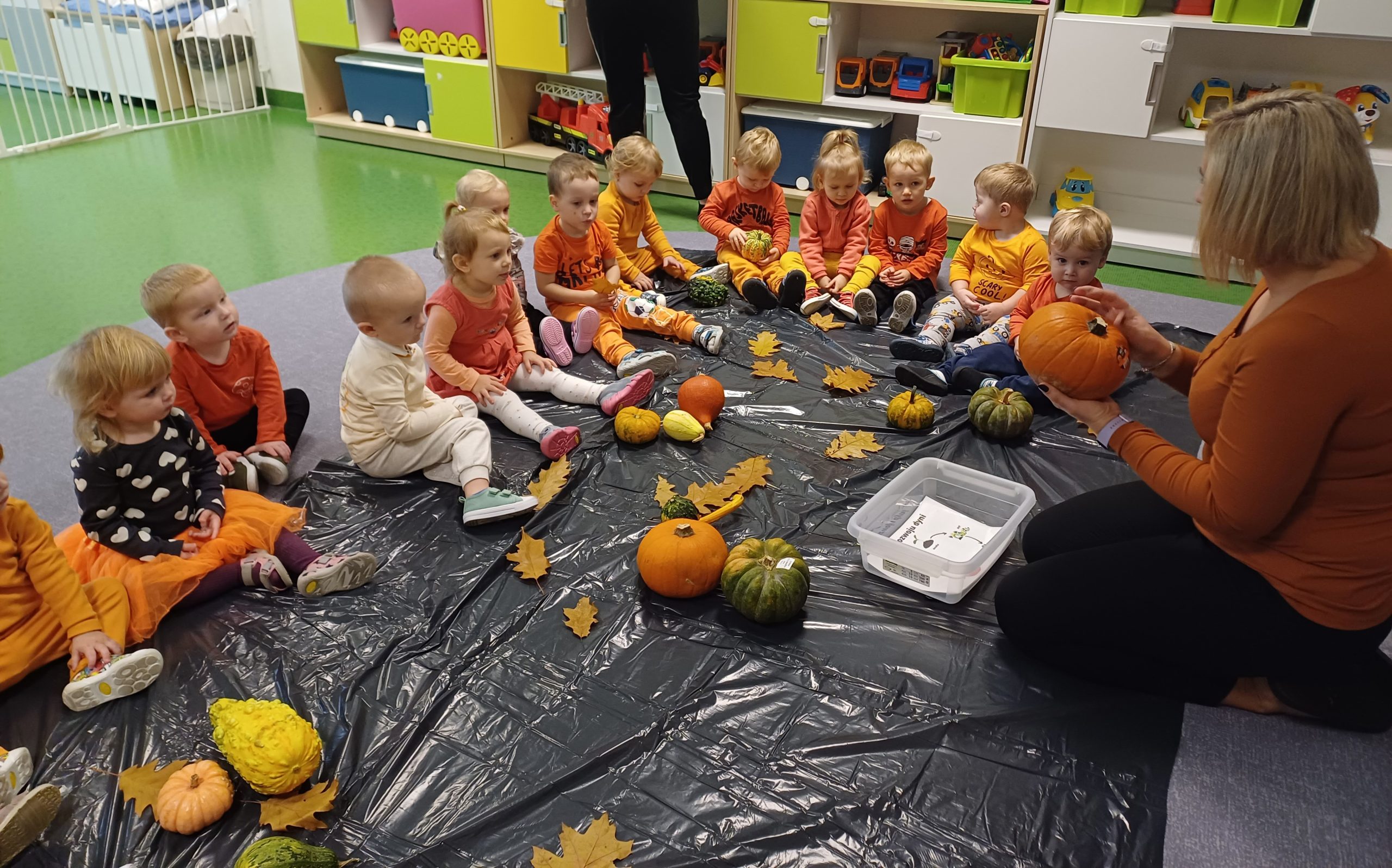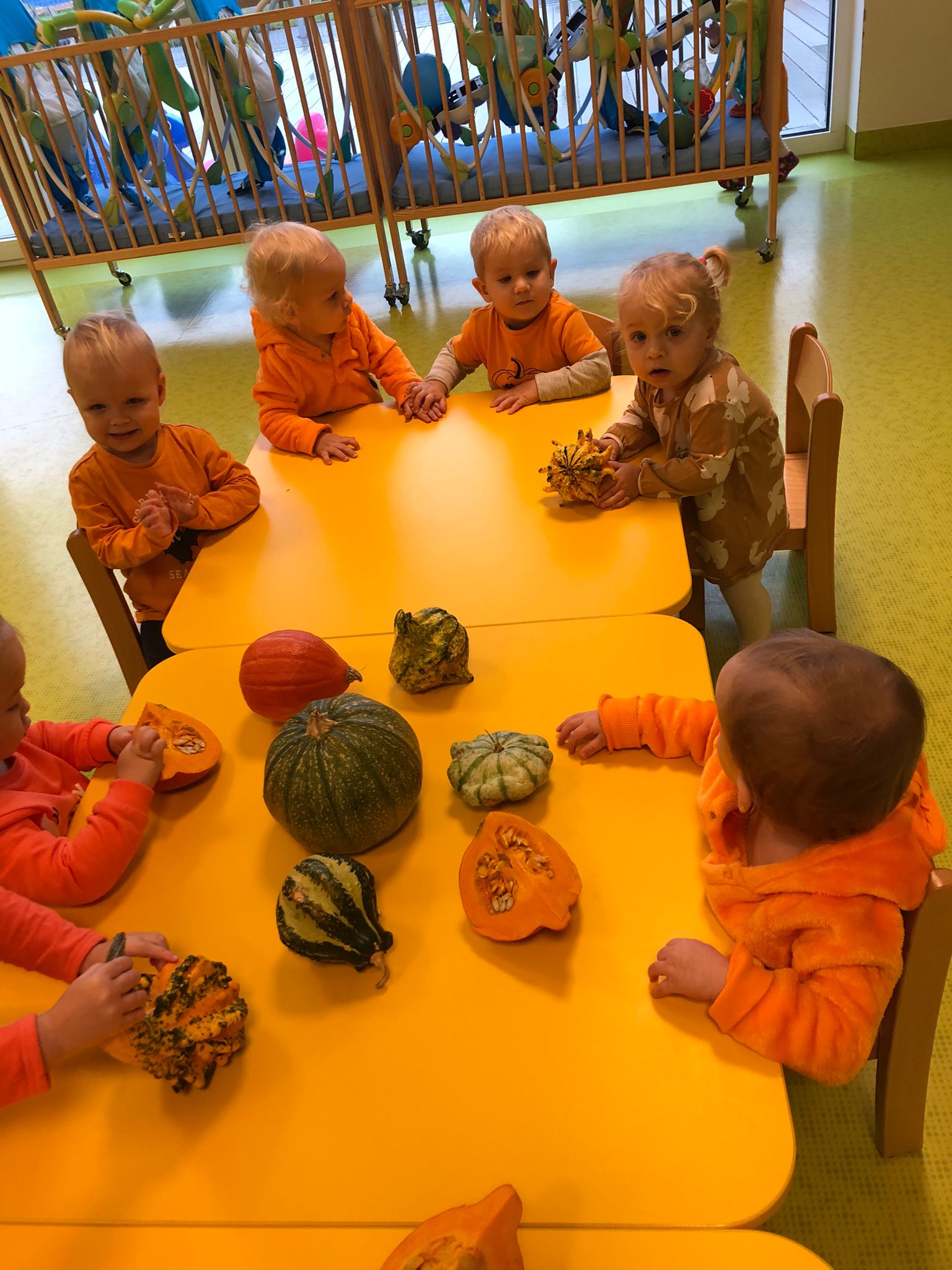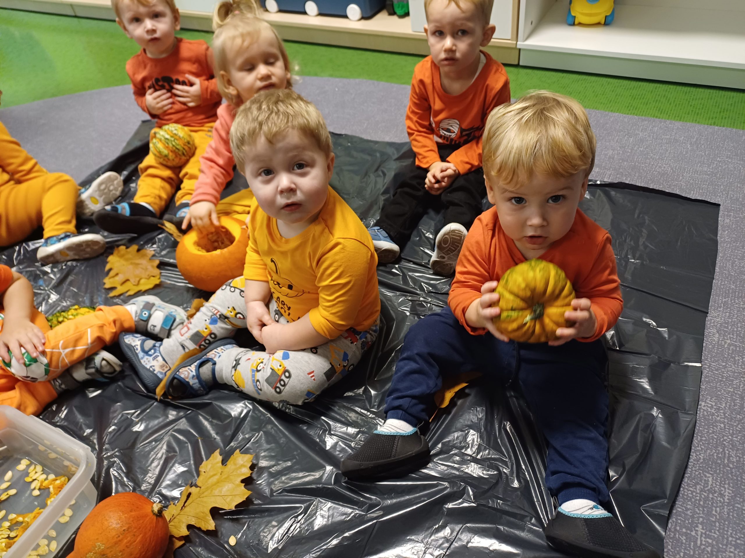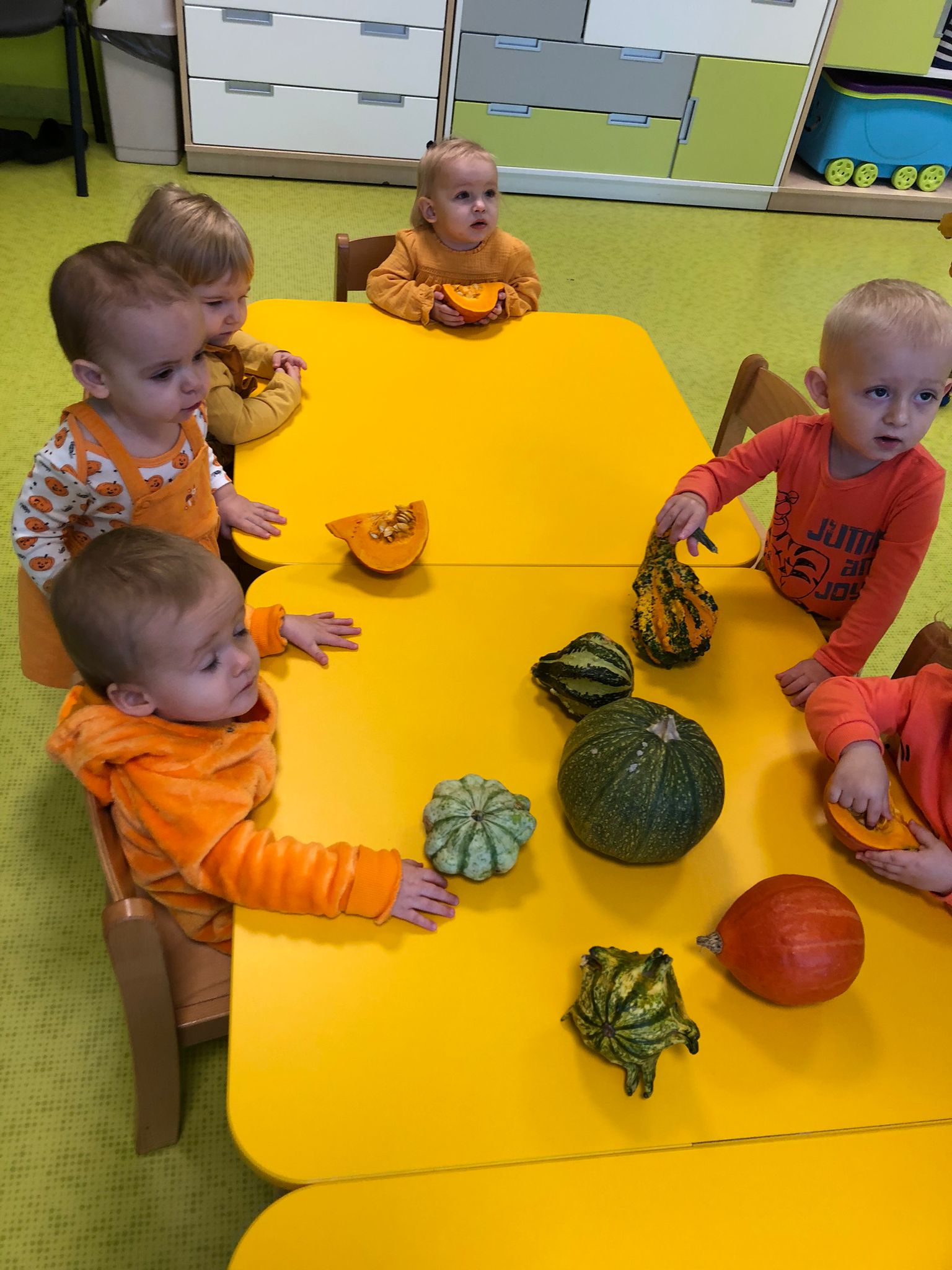 Dziś obchodziliśmy „Dzień dyni” w związku z tym nasze Motylki przyszły ubrane do żłobka na pomarańczowo. Dzieci miały okazje uczestniczyć w zajęciach związanych z tym dniem. Chętnie przyglądały się, dotykały oraz smakowały dynie. Zajęcia miały na celu stymulowanie wszystkich zmysłów.