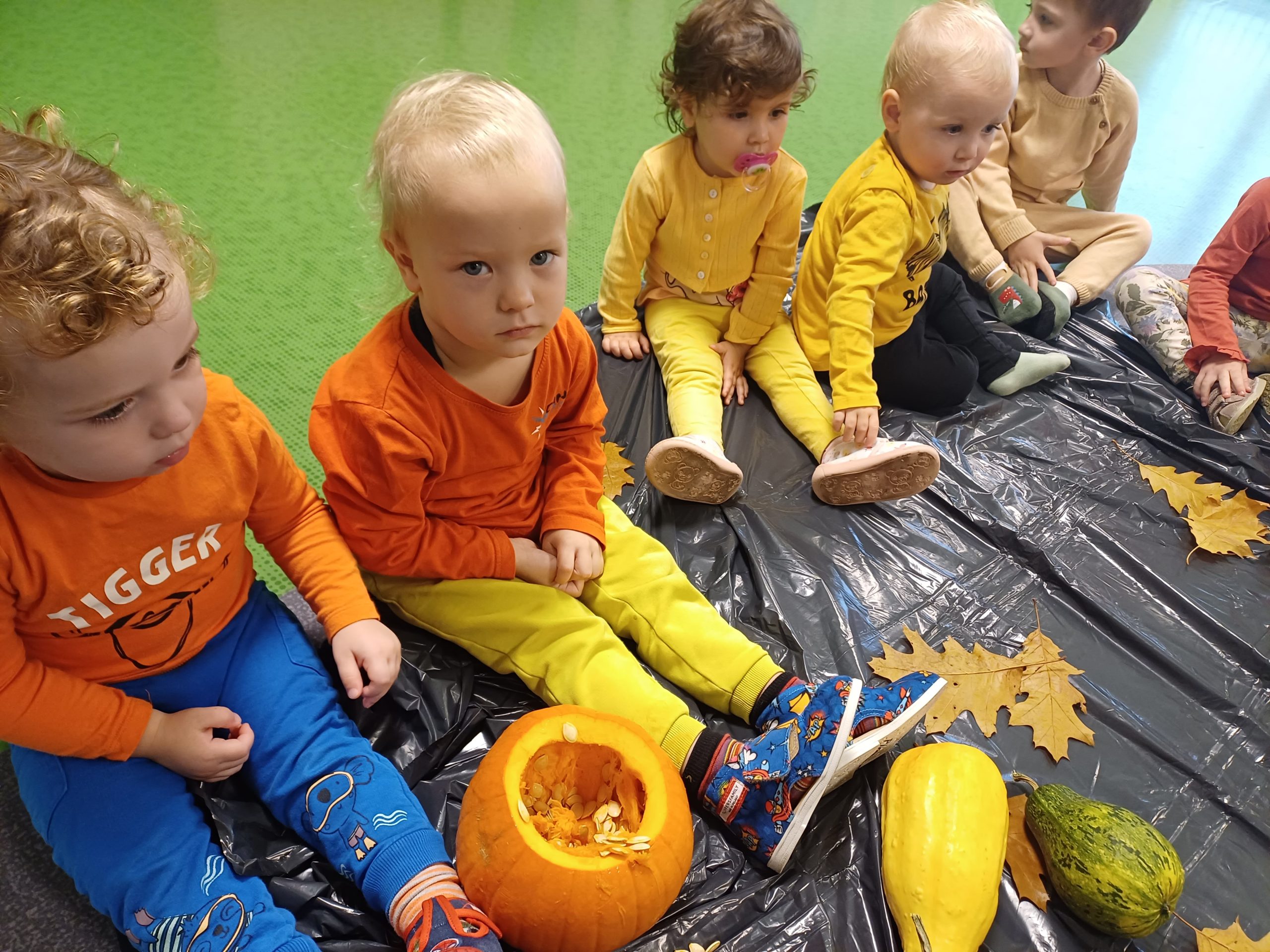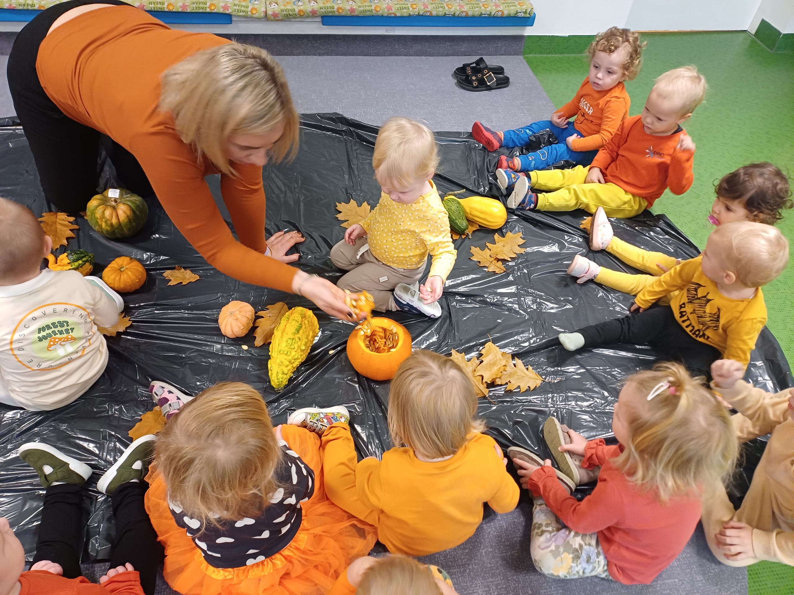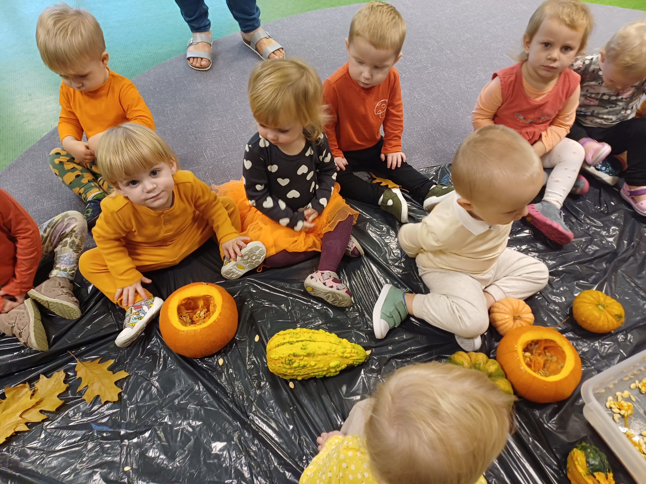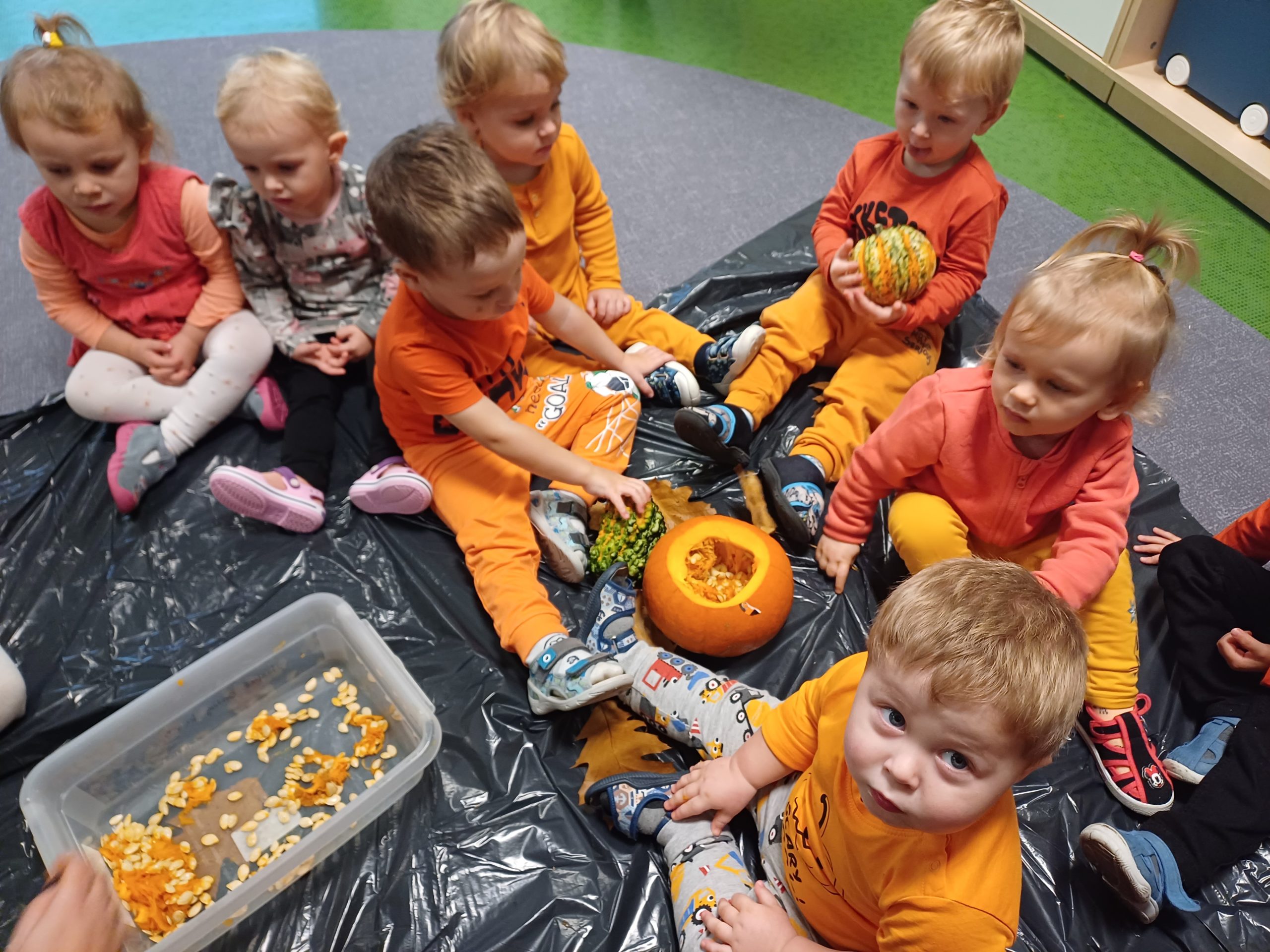 Dziś obchodziliśmy „Dzień dyni” w związku z tym nasze Motylki przyszły ubrane do żłobka na pomarańczowo. Dzieci miały okazje uczestniczyć w zajęciach związanych z tym dniem. Chętnie przyglądały się, dotykały oraz smakowały dynie. Zajęcia miały na celu stymulowanie wszystkich zmysłów.