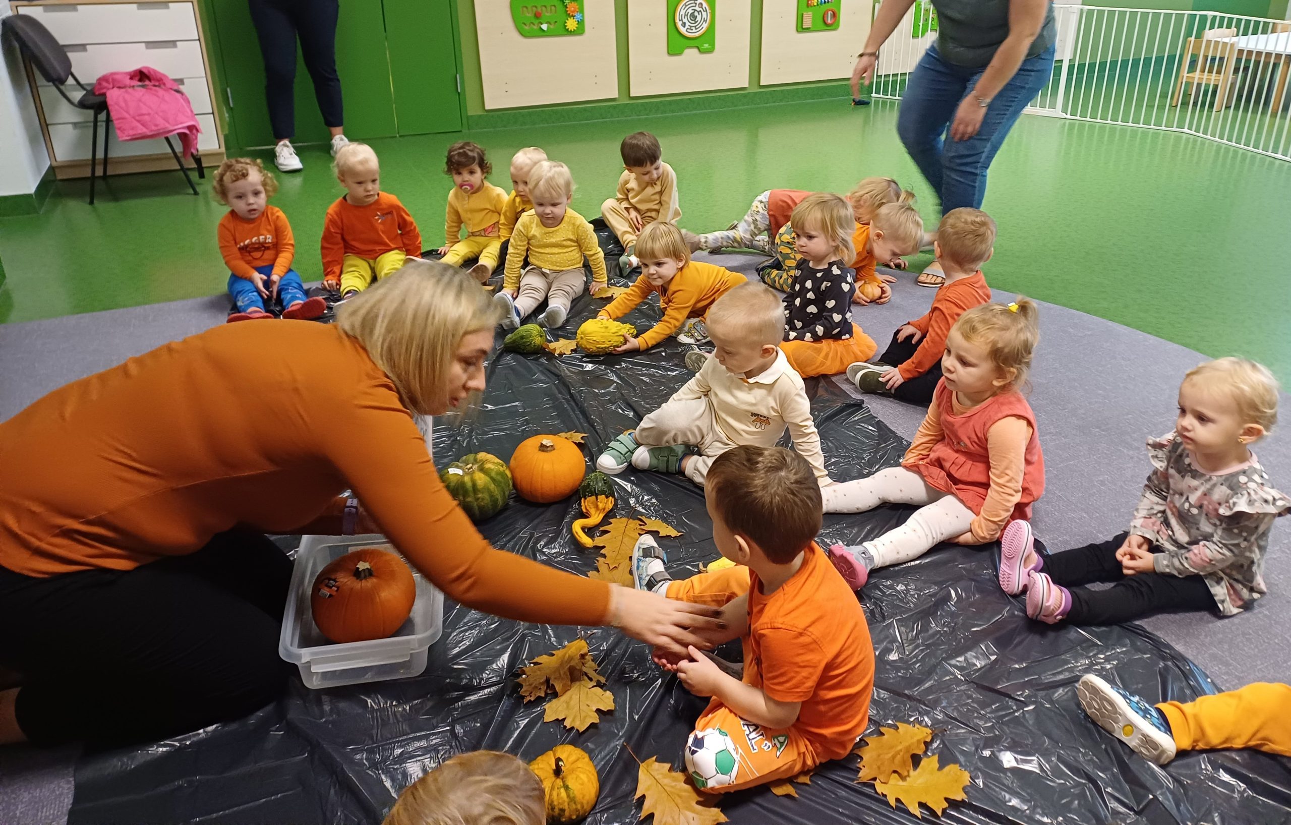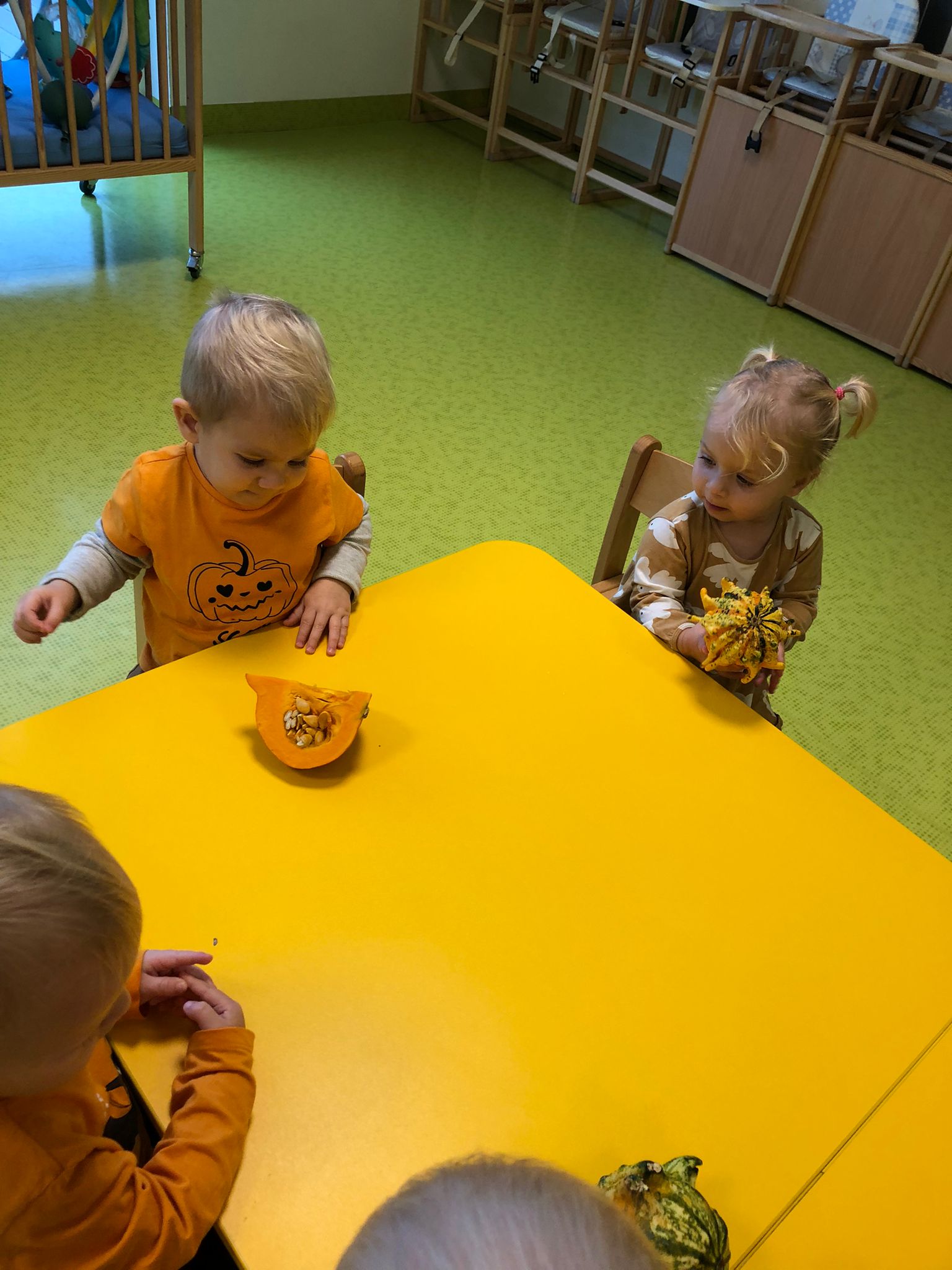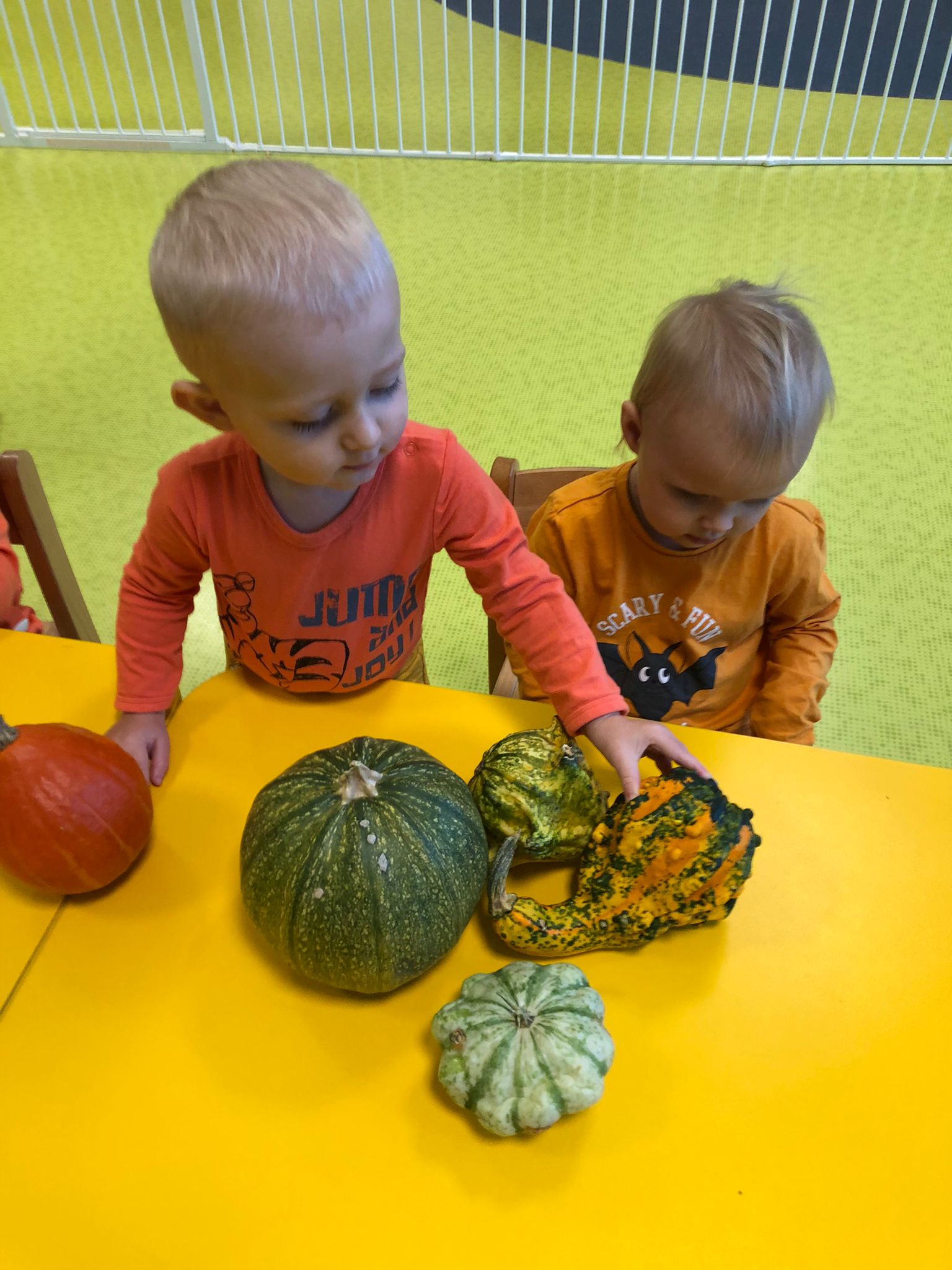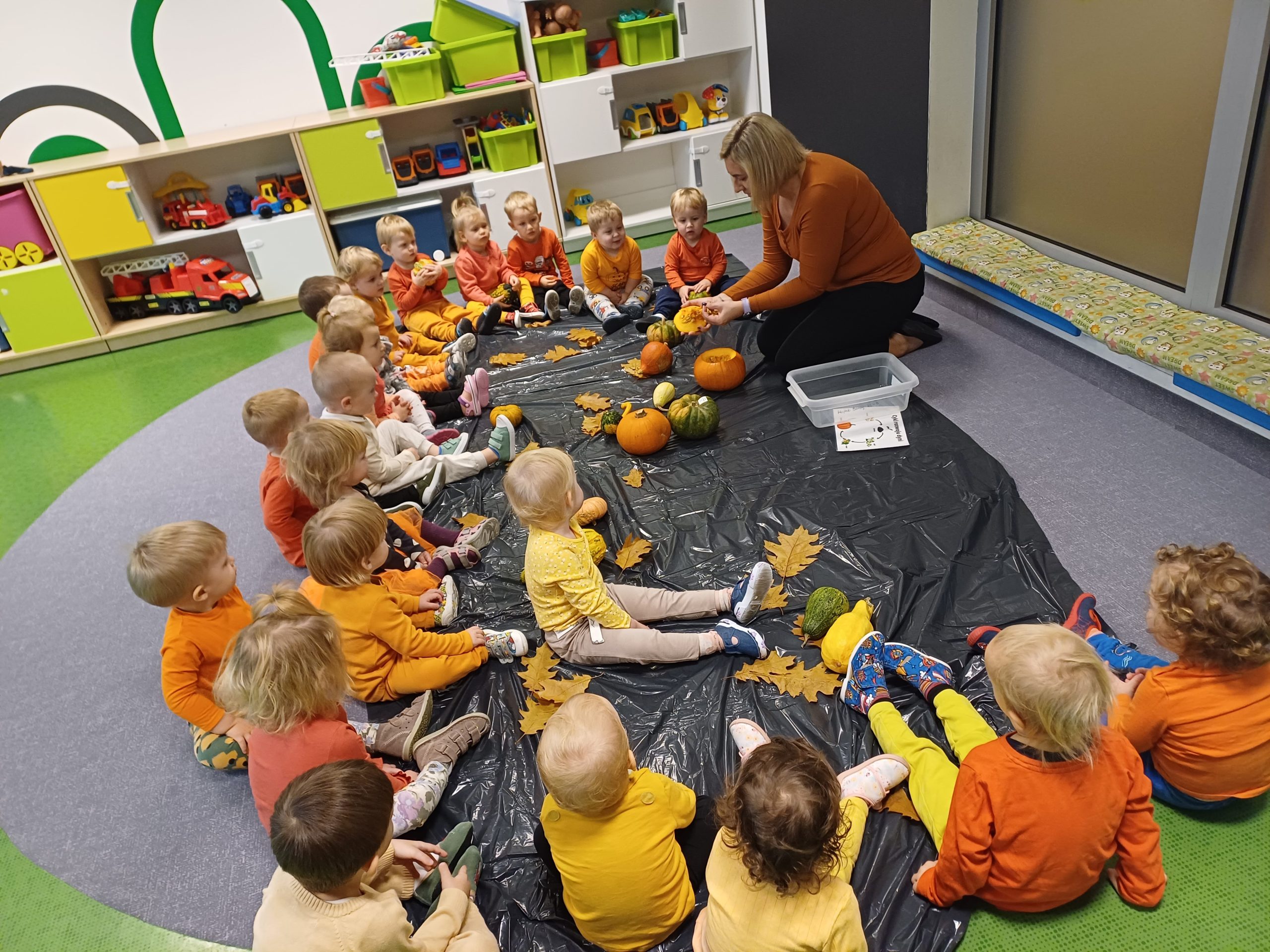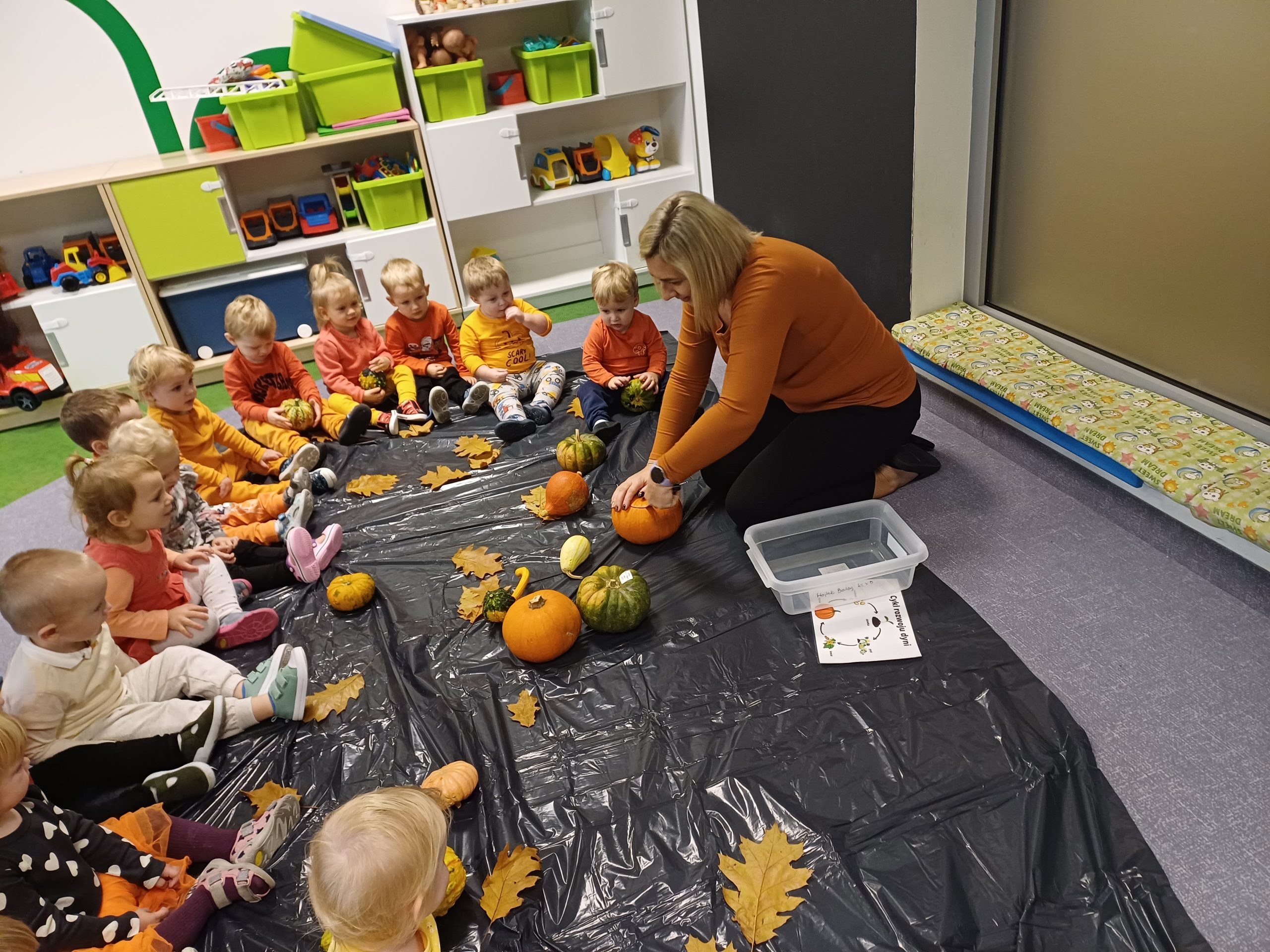 Dziś obchodziliśmy „Dzień dyni” w związku z tym nasze Motylki przyszły ubrane do żłobka na pomarańczowo. Dzieci miały okazje uczestniczyć w zajęciach związanych z tym dniem. Chętnie przyglądały się, dotykały oraz smakowały dynie. Zajęcia miały na celu stymulowanie wszystkich zmysłów.